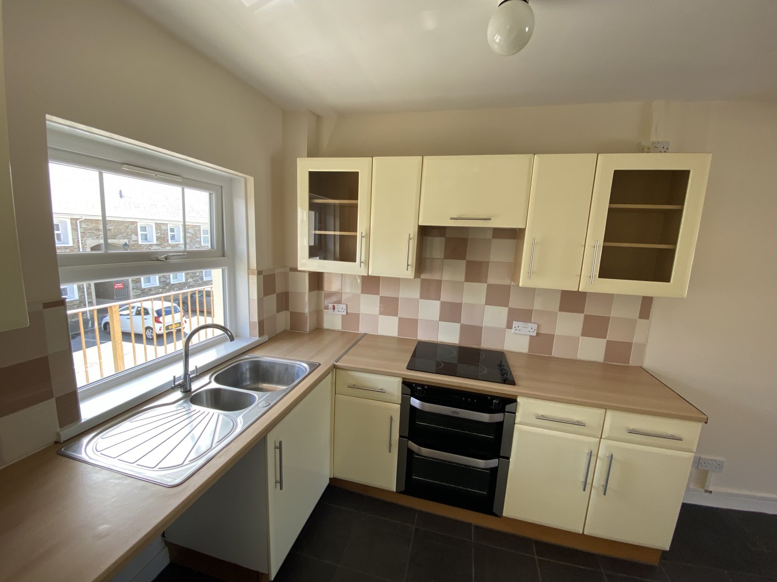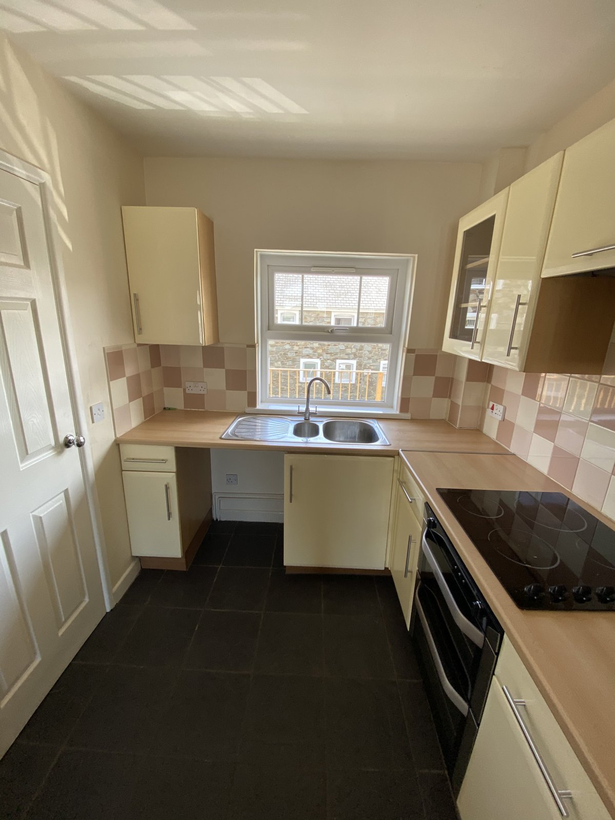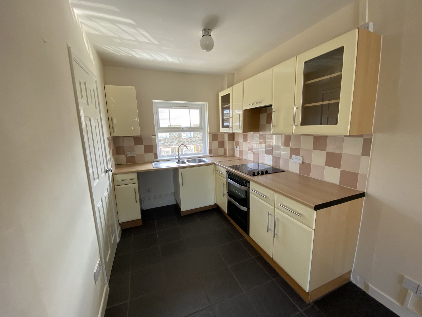 Fully fitted kitchen with intergrated electric oven & Hobb. Wall and base units, mono block stainless steel sink & drainer, light fitting, slate floor tiles, electric sockets,UPVC window.
