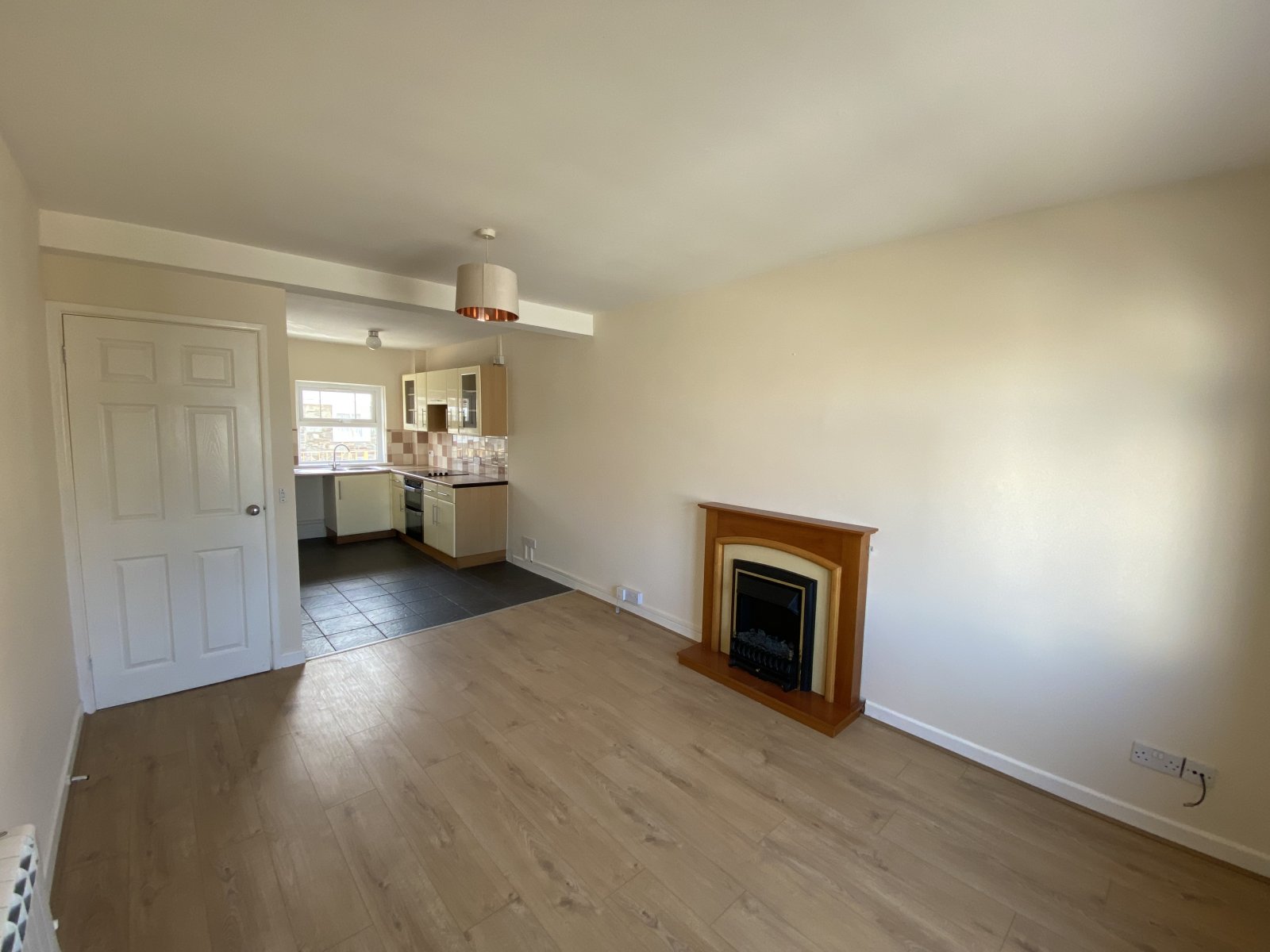Leading from the kitchen, open plan living room with Laminate flooring through out, wall mounted electric heater, electric feature fire place and surround, Double glazed wooden window unit, TV point and electric sockets, light fitting.