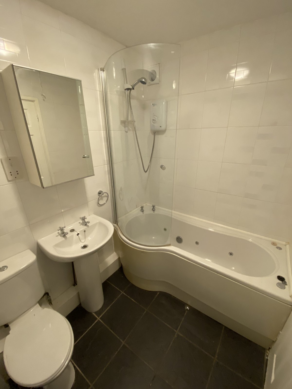 Fully fitted bathroom suite (Wash hand basin, bath & toilet) in white with electric shower over bath, chrome heated towel rail, light fitting, slate tile flooring.