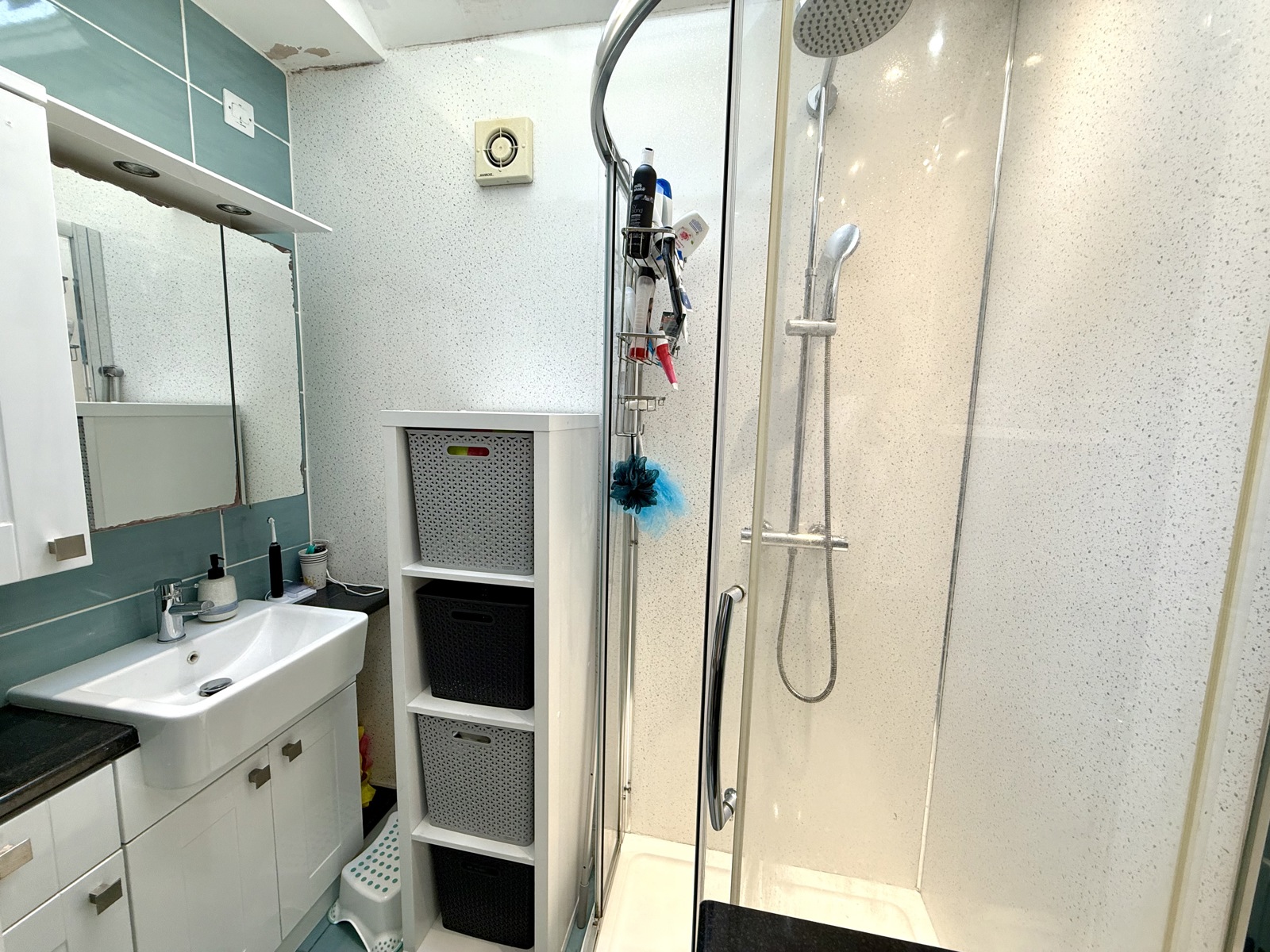 Tiled flooring, shower, wash hand basin, toilet and space for washing machine and tumble dryer. Fitted cupboards also. uPVC double glazed velux window.