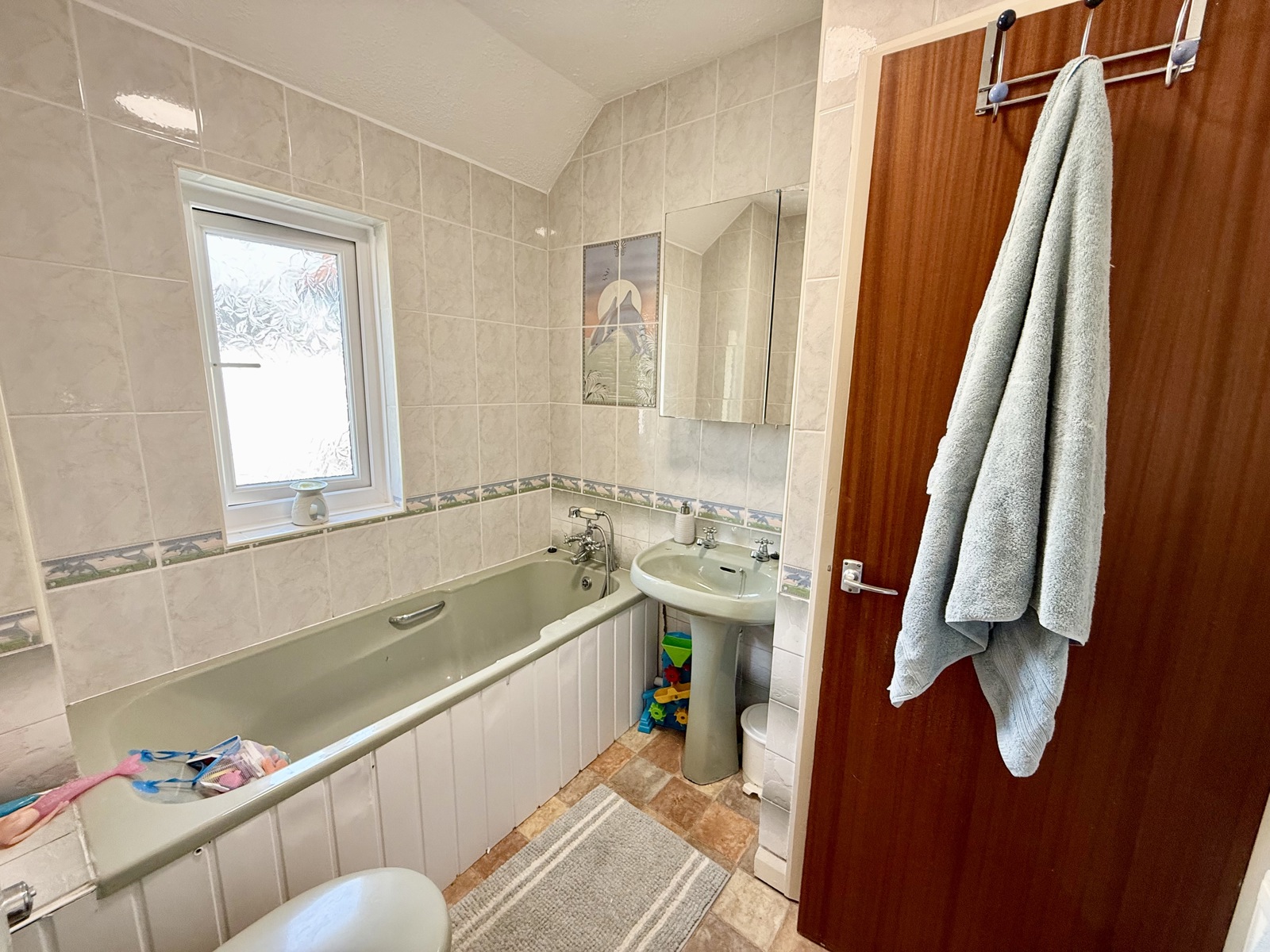 Vinyl flooring, bath against the wall, wash hand basin and toilet. Obscured uPVC double glazed window to the front and a built in storage cupboard.