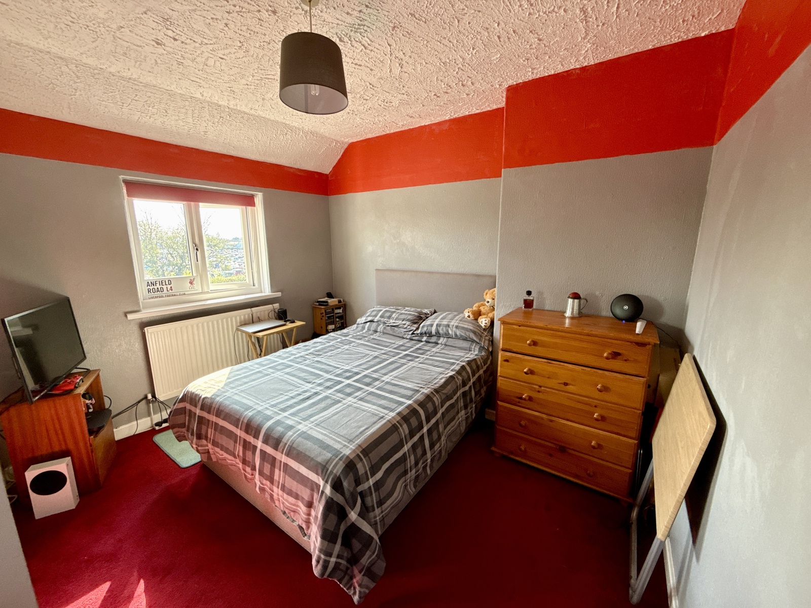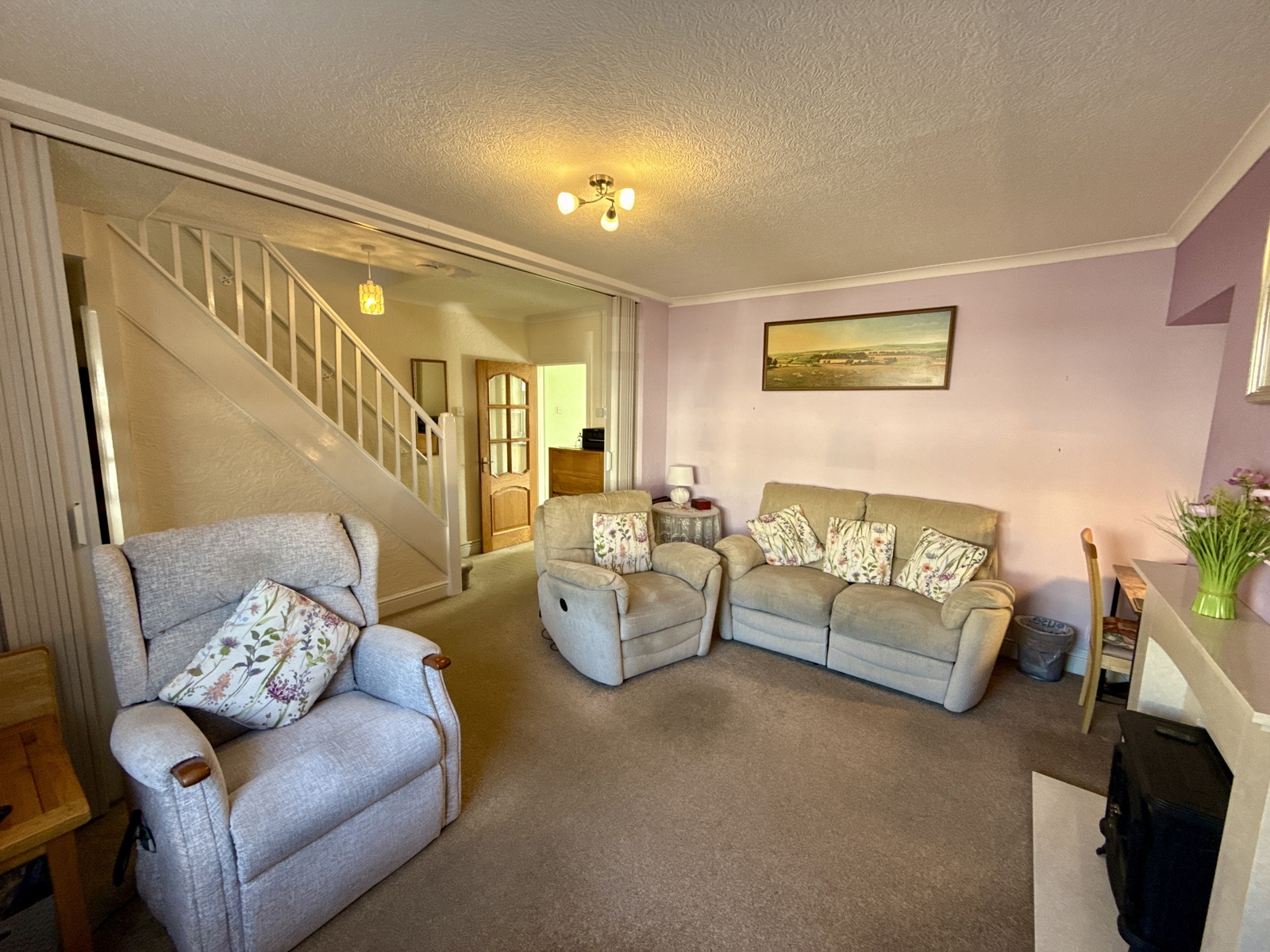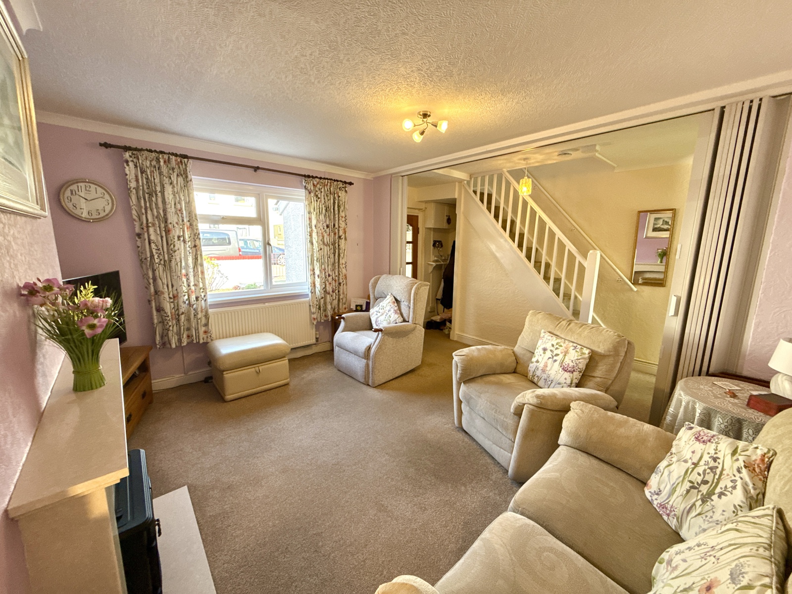 Carpeted flooring, shutter doors that you can pull shut for energy efficiency and to shut the room off from the rest of the house. uPVC double glazed window looking out to the front of the property with a radiator underneath.