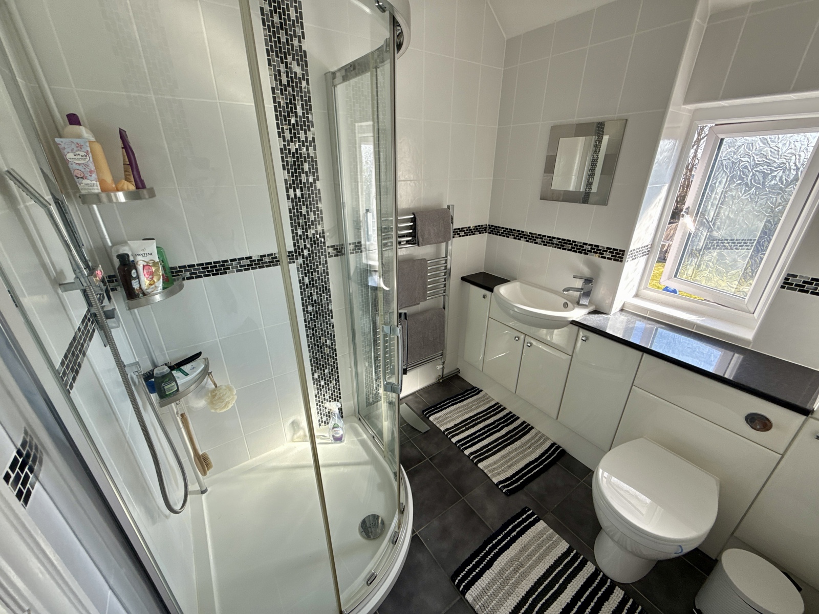 Walk in shower, wash hand basin and toilet.