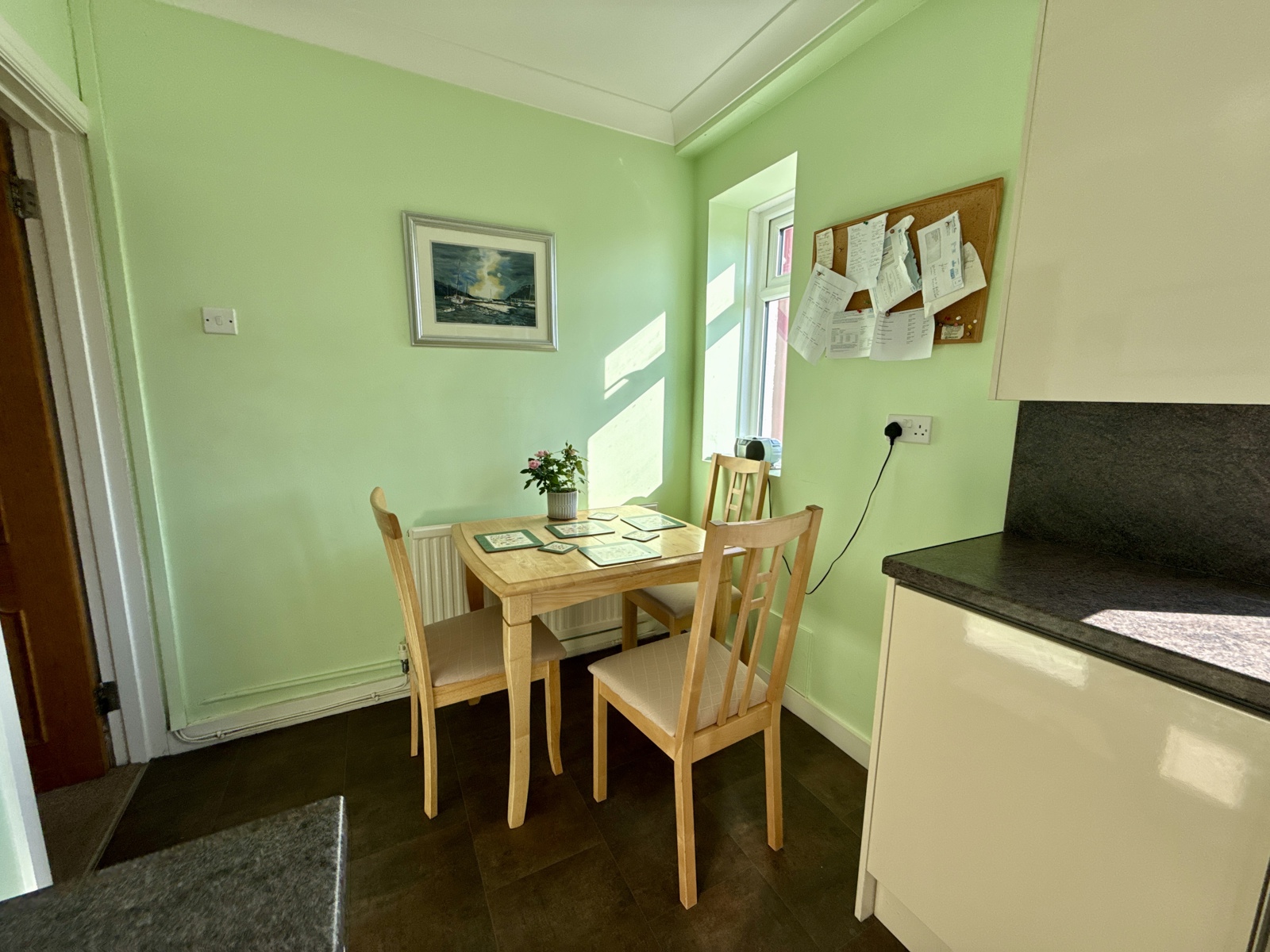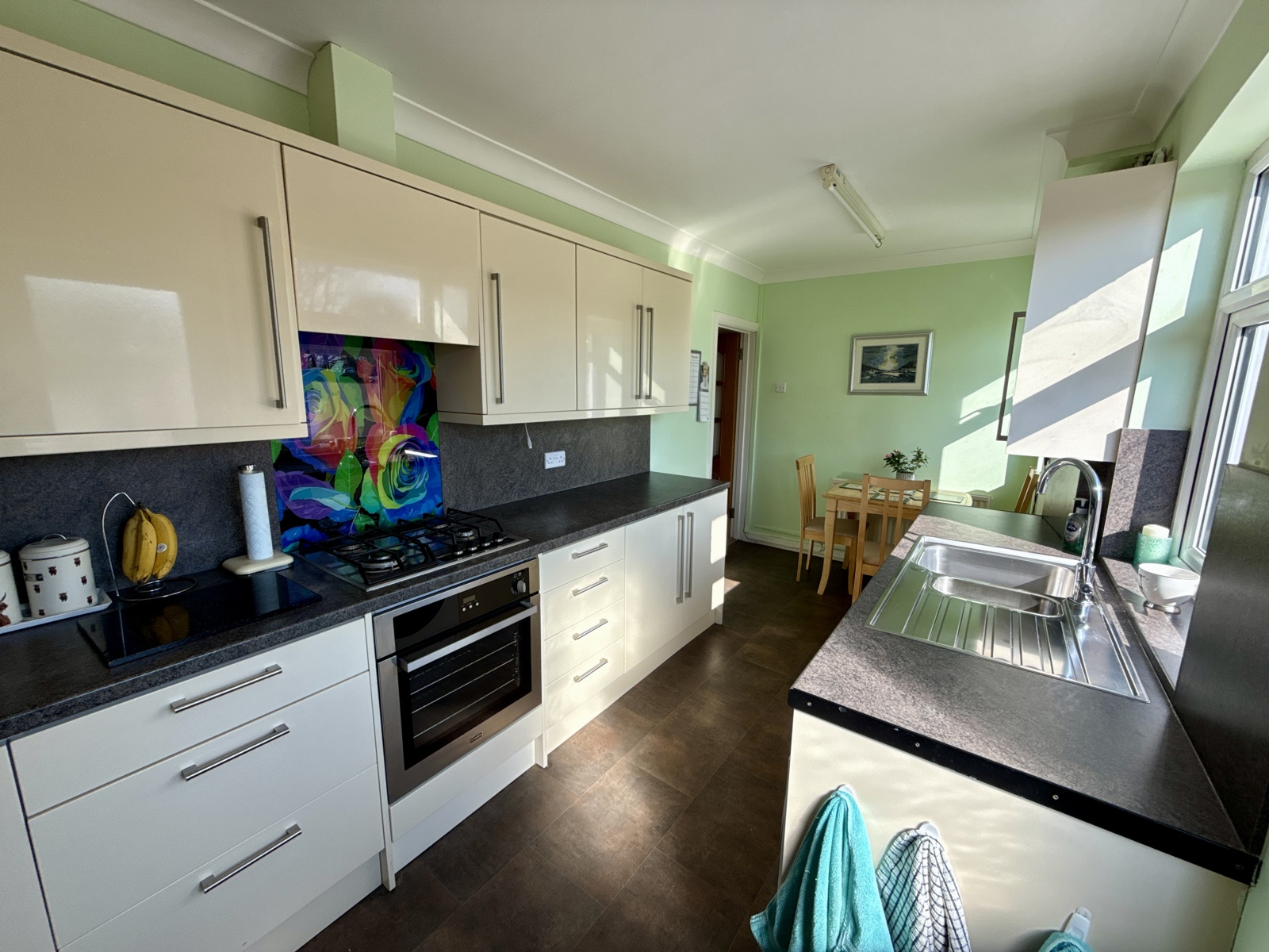 Vinyl flooring, fitted kitchen units and space for dining table. Gas boiler is located in a kitchen cupboard and was recently fitted last year. Two uPVC double glazed windows looking out to the rear of the property and a uPVC door leading to the garden.
