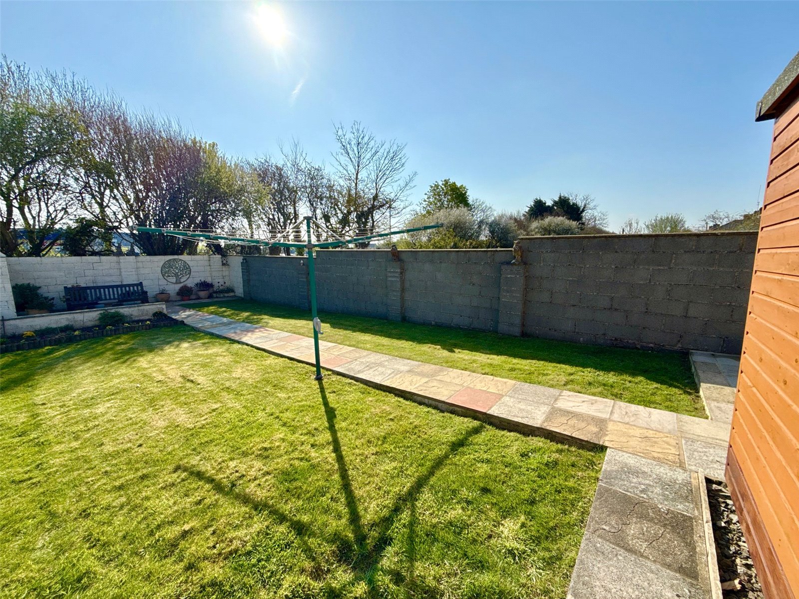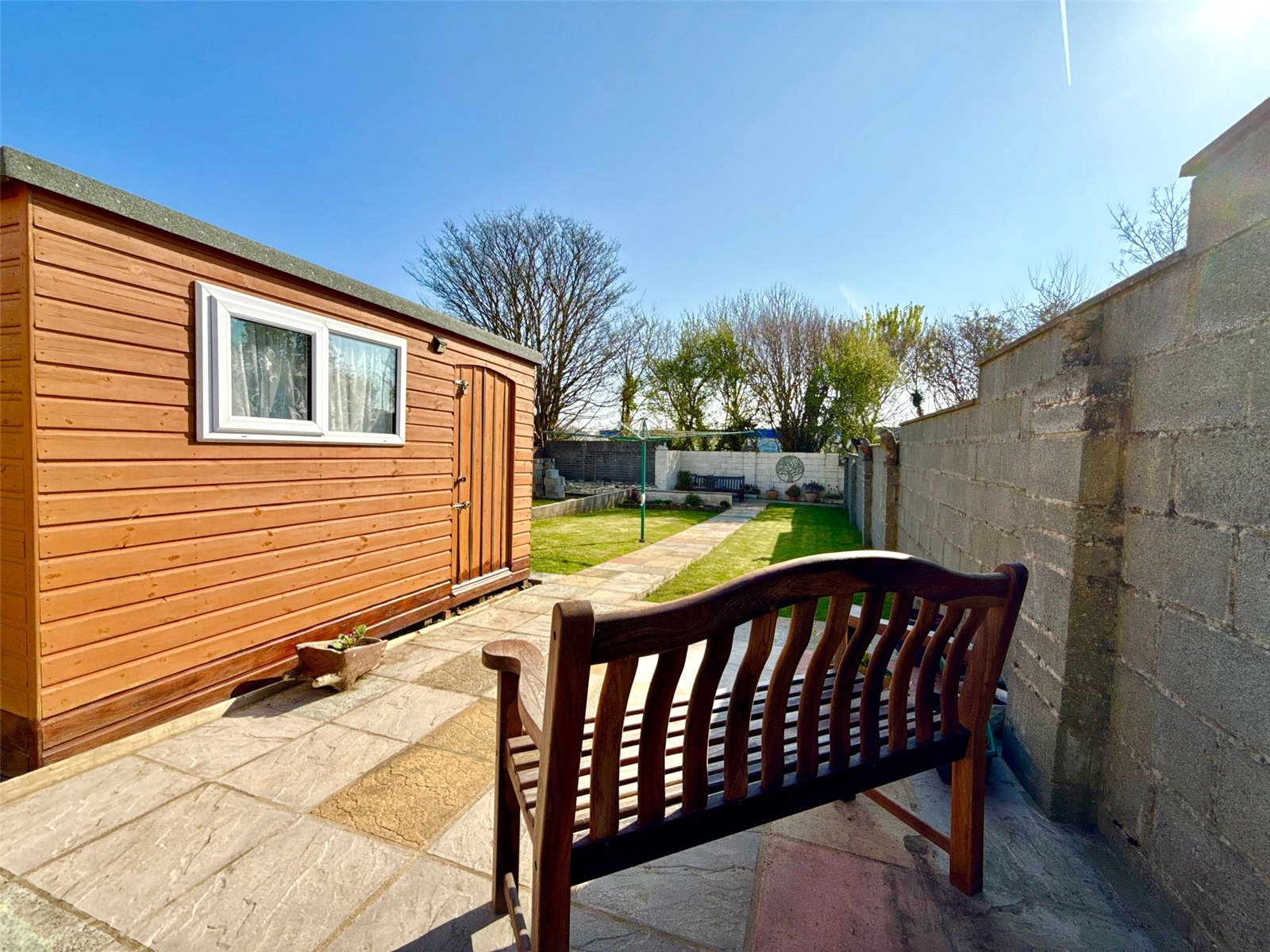 To the rear of the property there is a fabulous size garden with patio slabs to begin and sheds for storage. There is then a section laid to lawn before another patio area at the bottom with a flowerbed for growing flowers and plants.