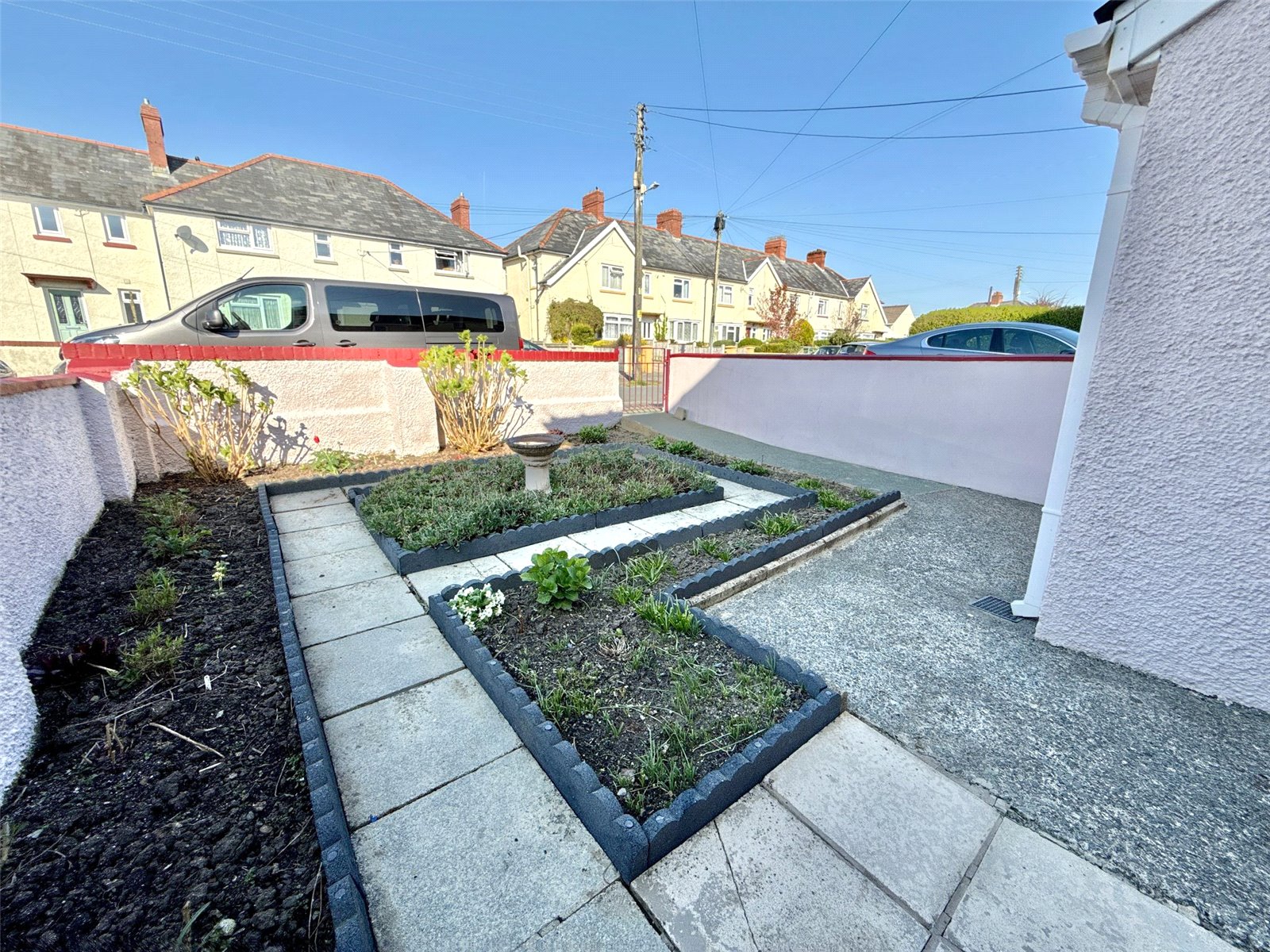 To the front of the property you have patio slabs/concrete with soil areas for flowers and plants, there is potential to turn this into a driveway subject to the relevant planning consents.