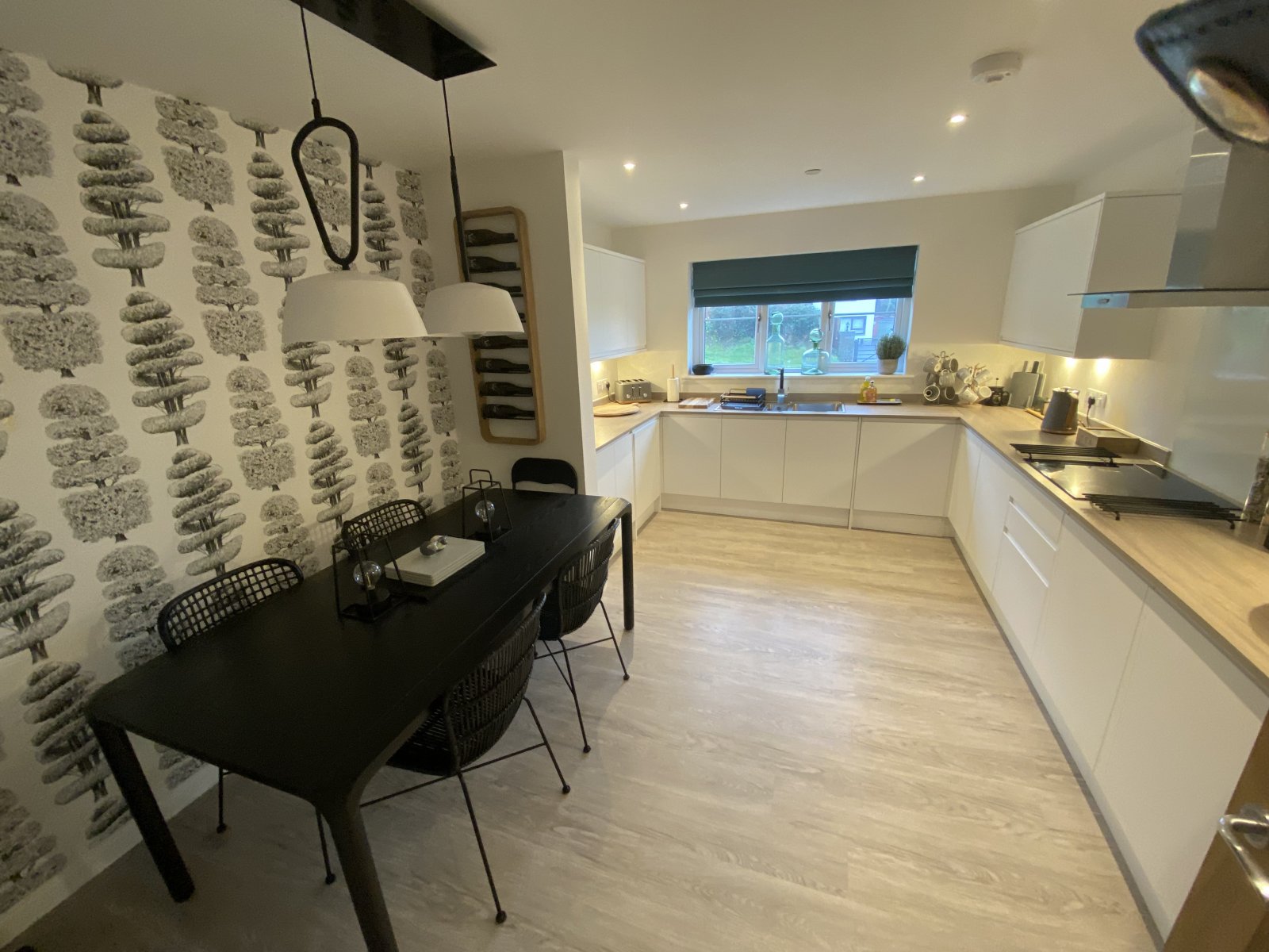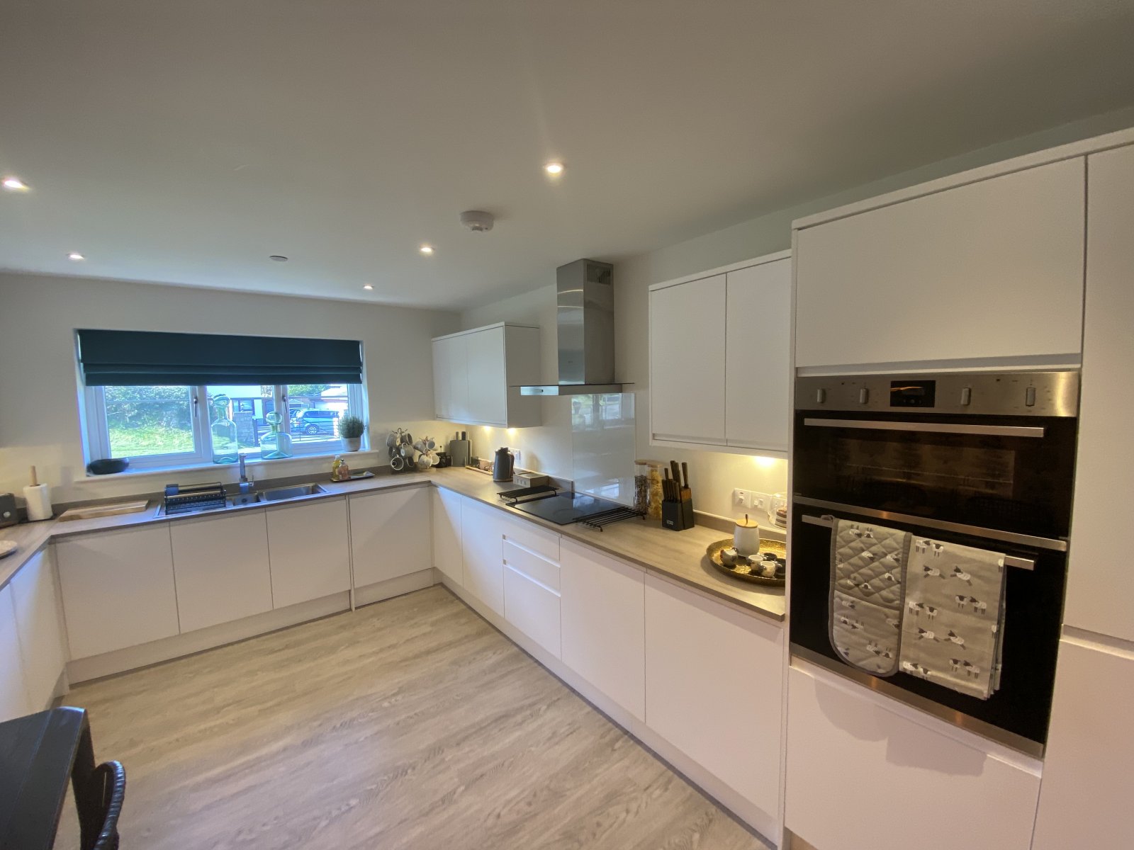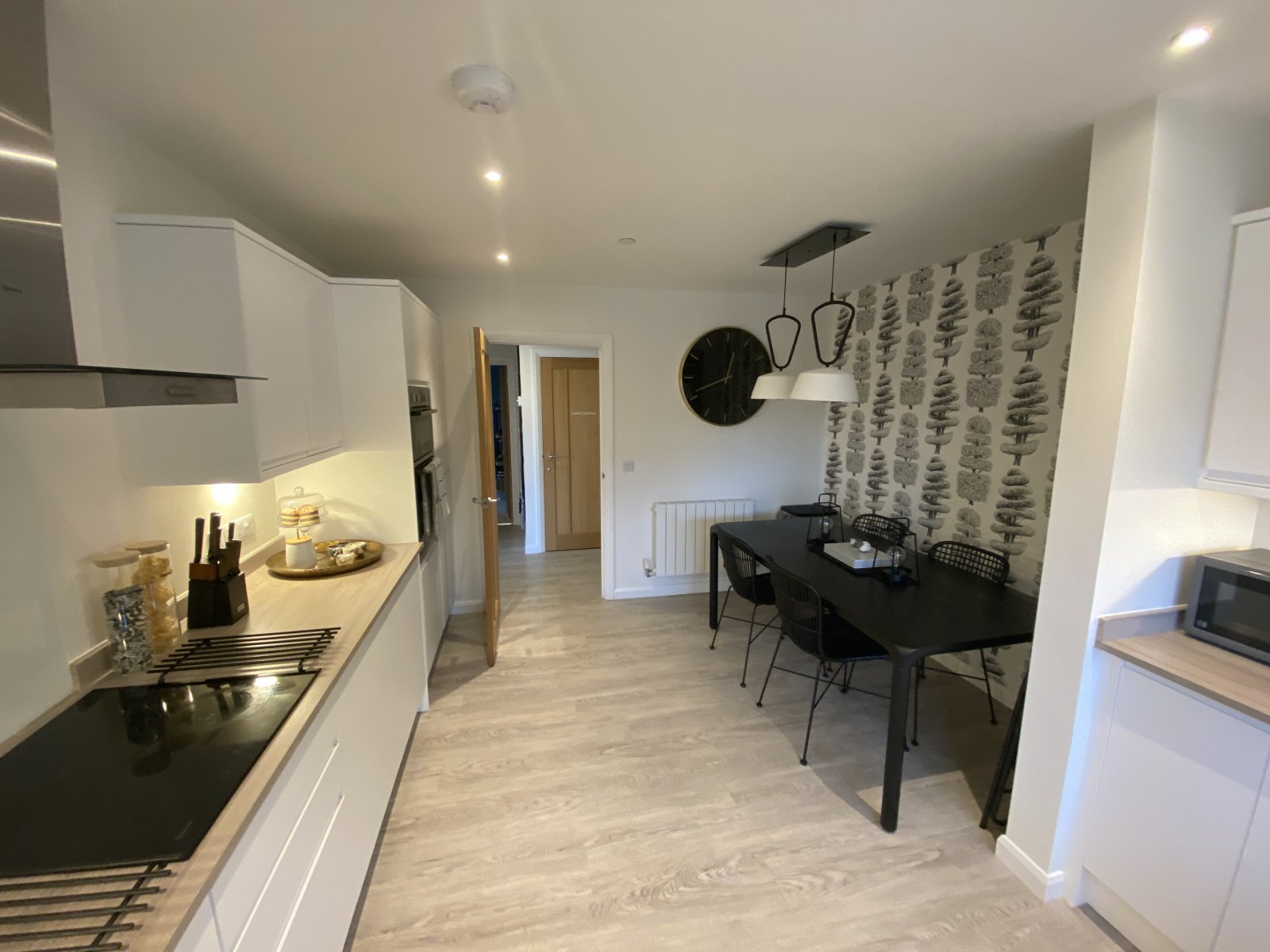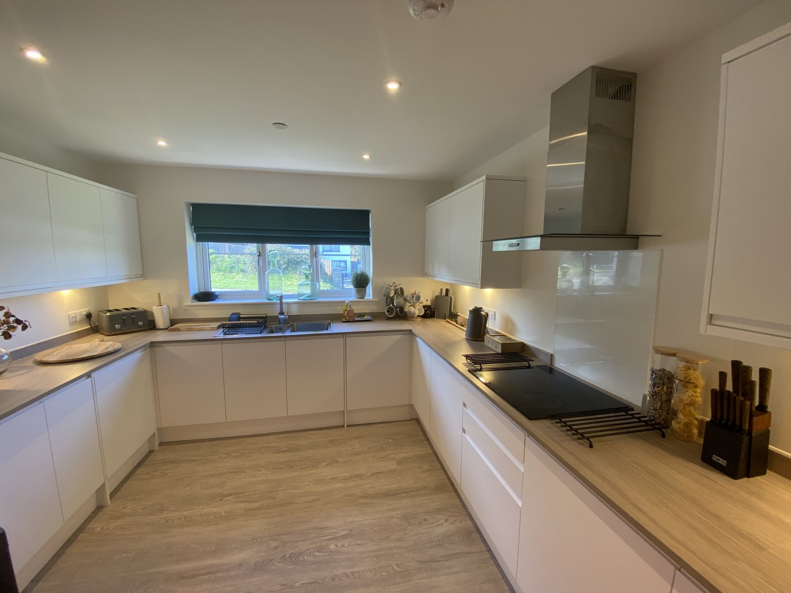 Modern spacious fitted kitchen with ample wall and base units, integrated oven and hob, extractor hood, Fridge/freezer and washing machine. Radiator,UPVC window.