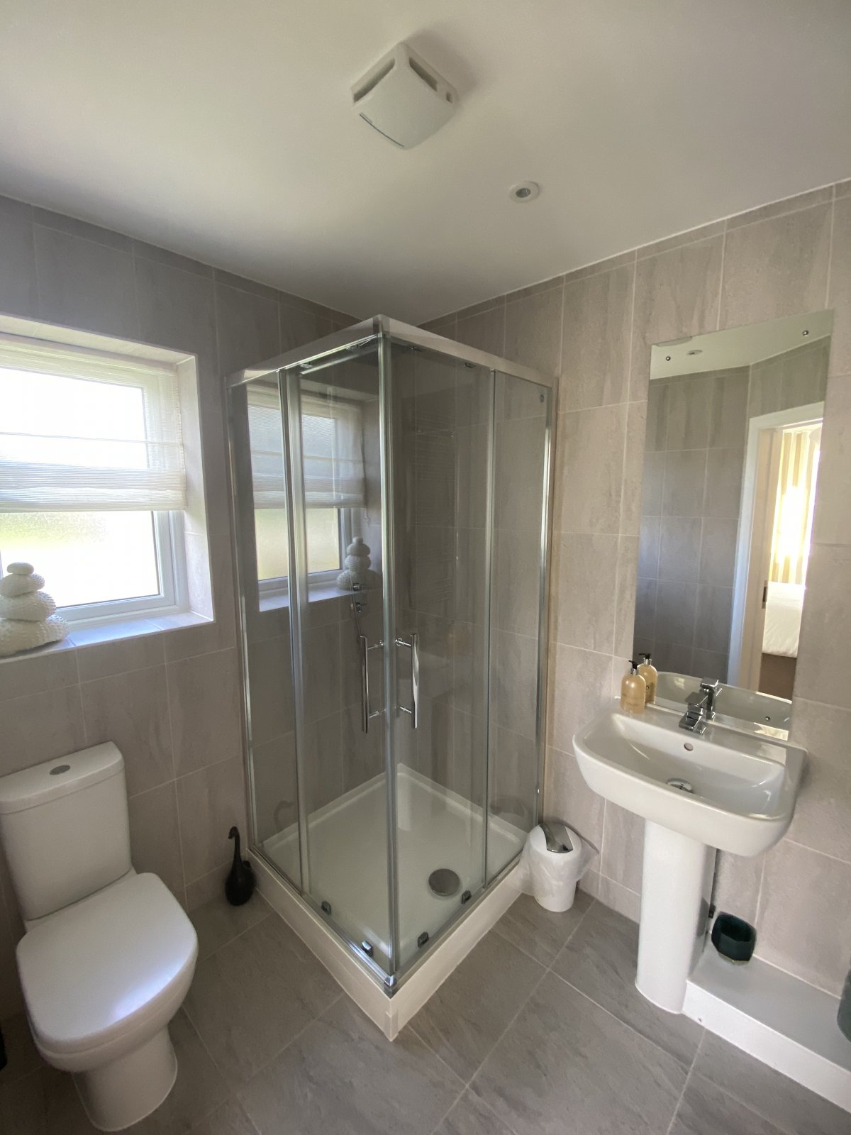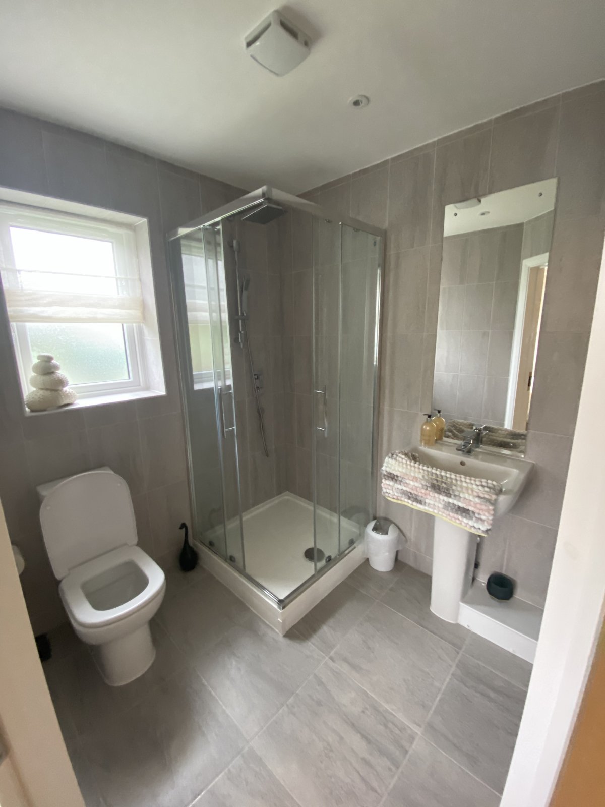 Tiled flooring, UPVC window, shower cubicle, WC, WHB, light fitting.