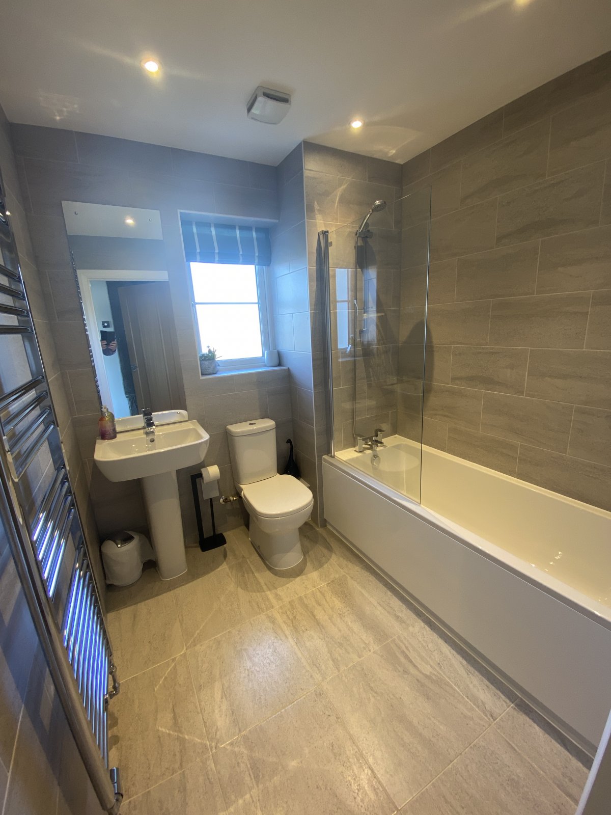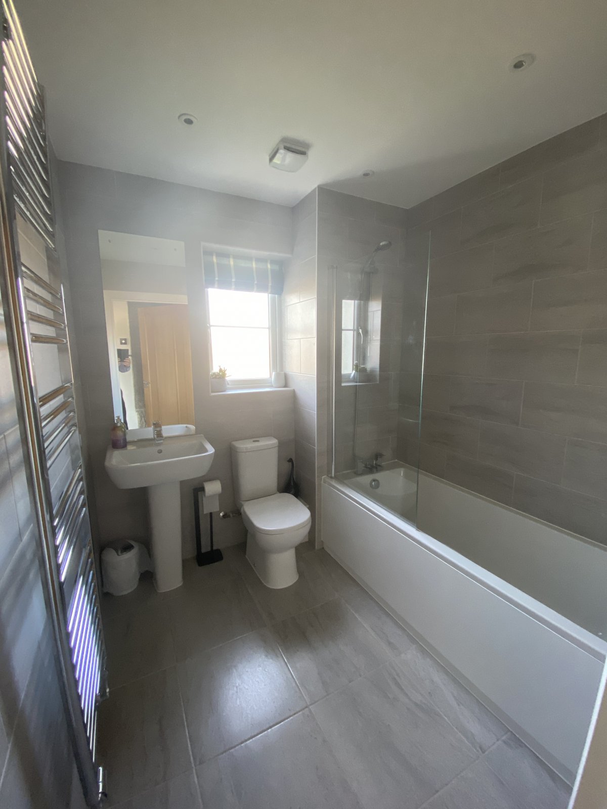 Tiled flooring, white modern 3 piece suite with shower over bath, UPVC window, heating towel rail.
