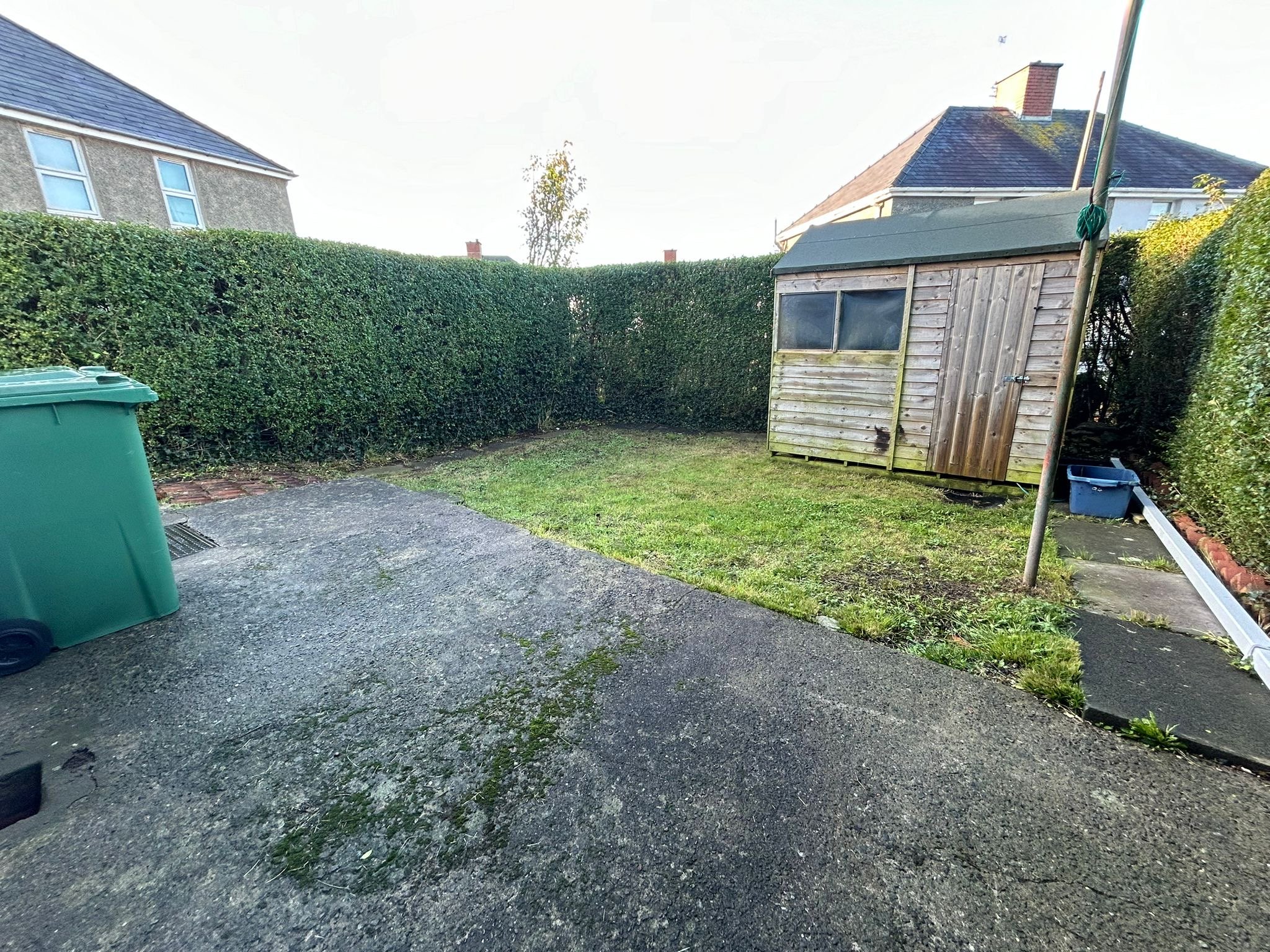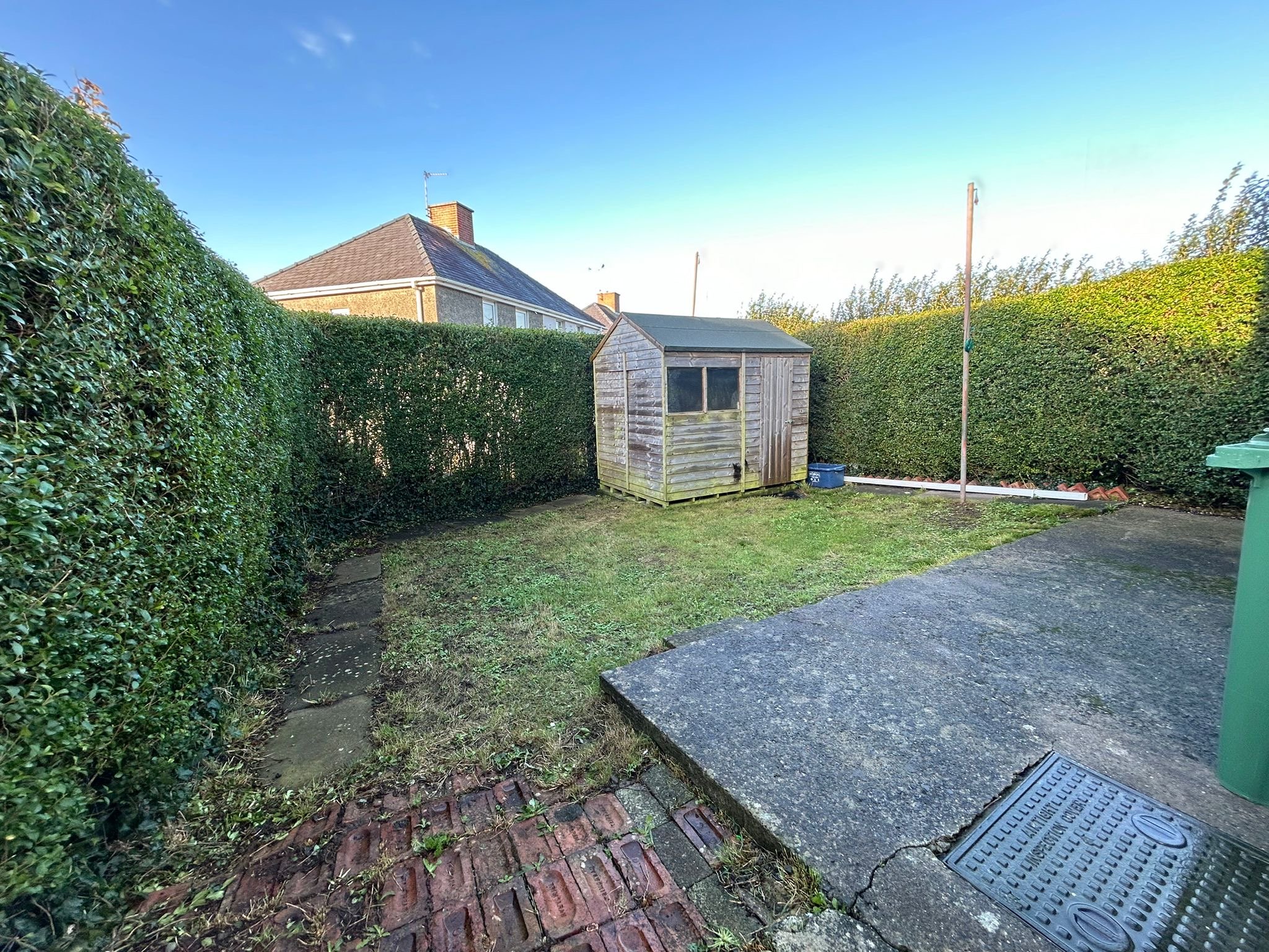 To the front the property is set back off the road with a front lawned garden and side access to the enclosed, grassed rear back Garden which is ideal for the children to play out and enjoy. There is also a wooden shed which will remain with the property. Parking may be a possible option with the correct permission in the front garden area.