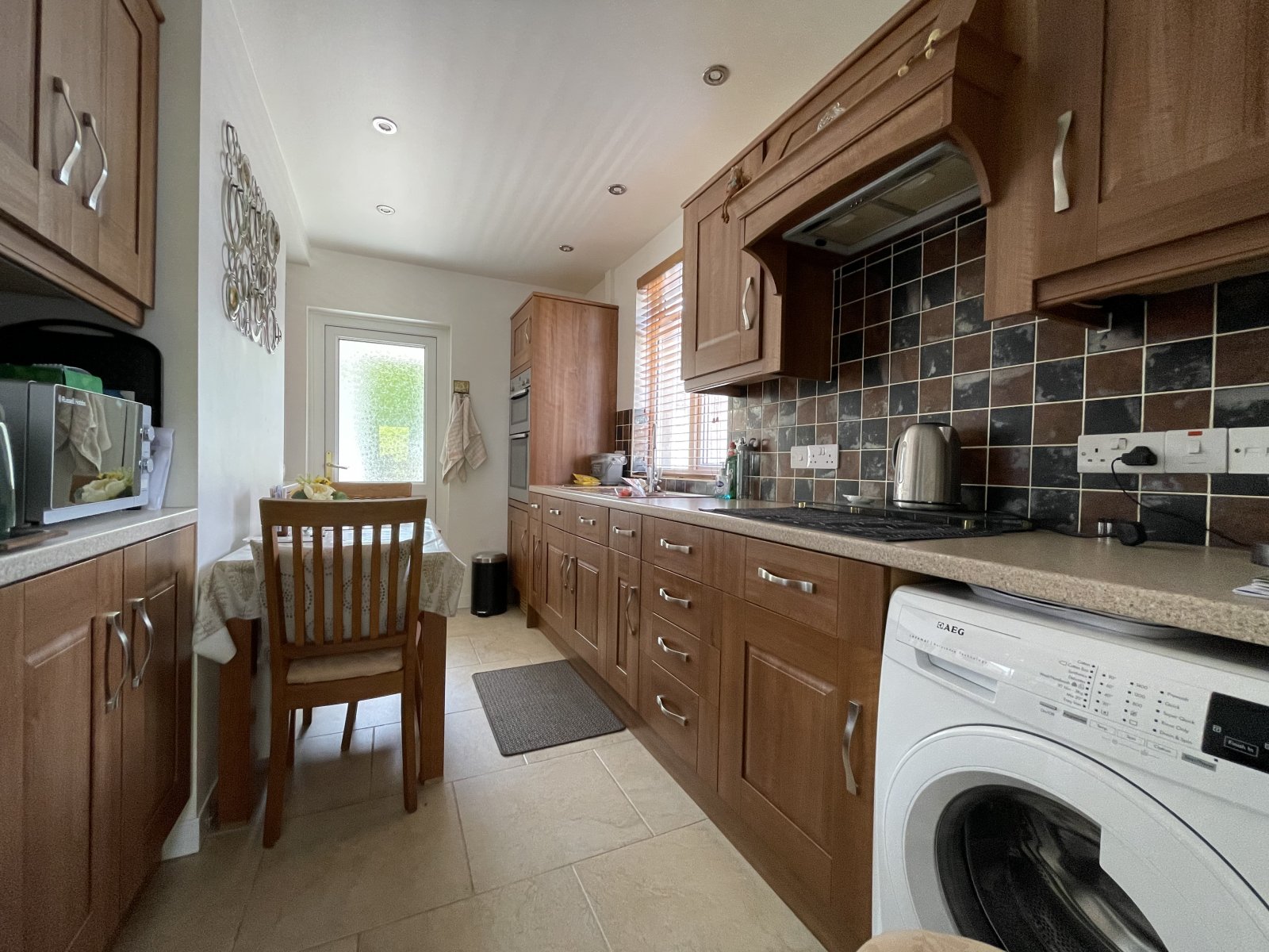 Tile flooring, range of base and eye level units, sink and drainer, tile splashback, induction hob, integrated oven and fridge freezer, space for washing machine, double glazed uPVC window to side.