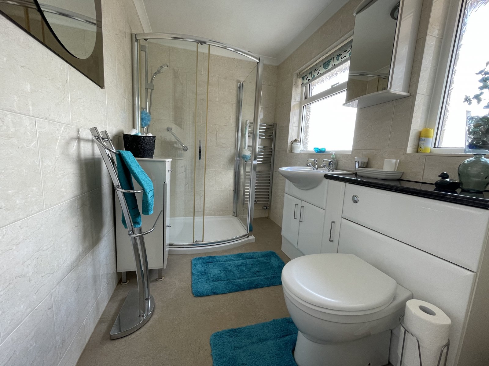 Lino flooring, WC, wash hand basin, double shower cubicle, fully tiled walls, heated towel rail, obscure glass double glazed uPVC window to side.