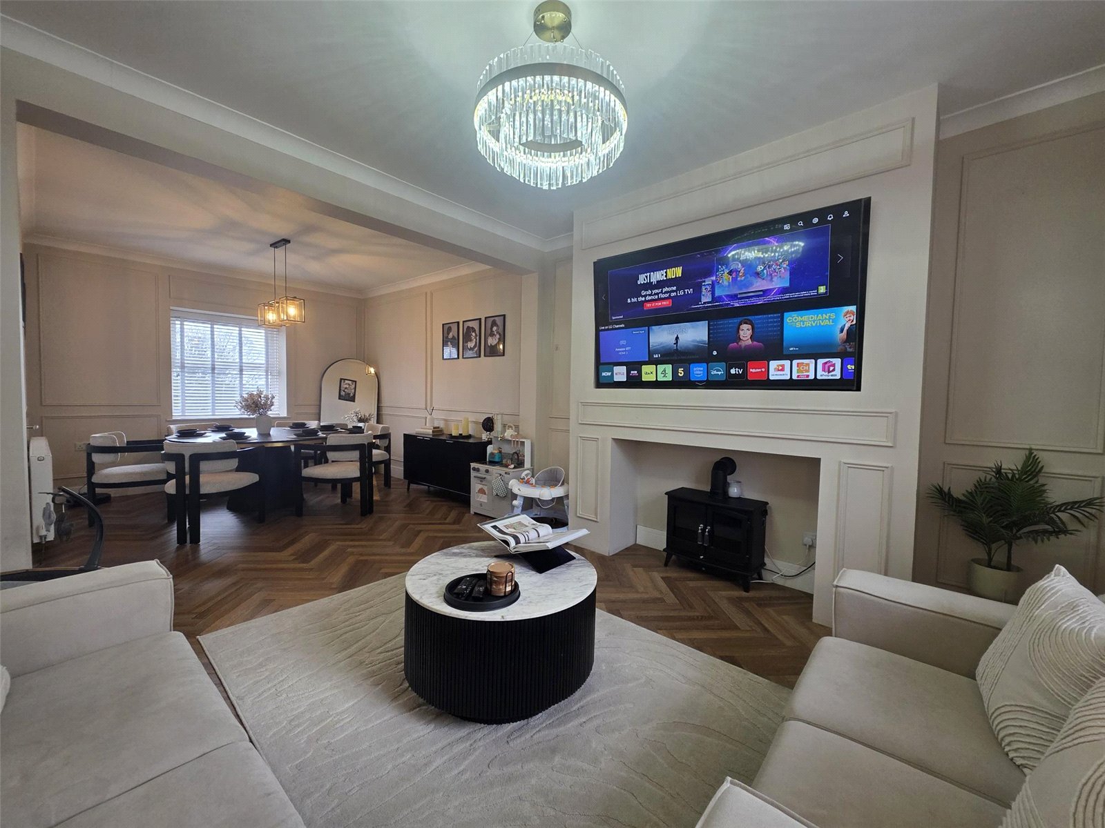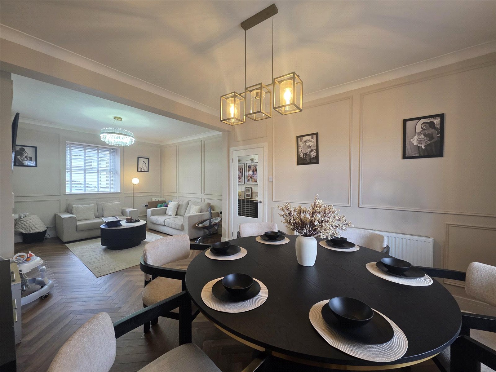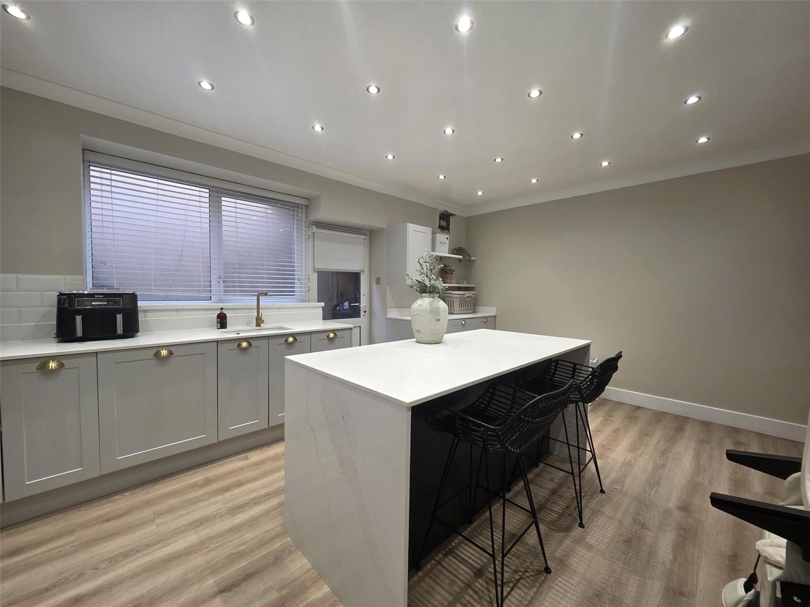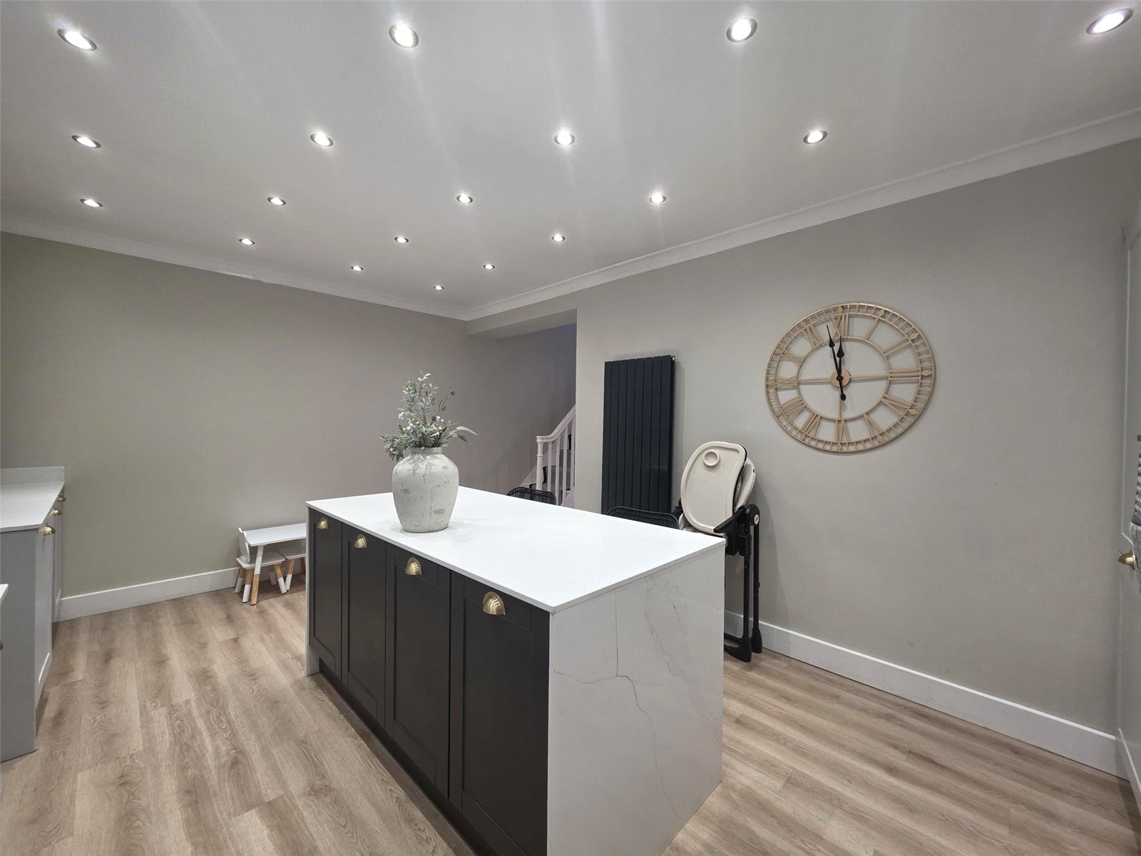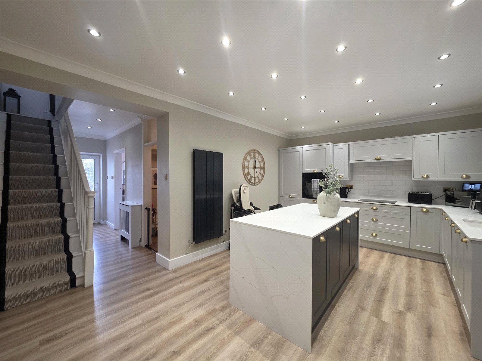 The property features a stunning kitchen where no expense has been spared — complete with high-quality built-in appliances, sleek cabinetry, and a central island perfect for family gatherings or entertaining guests. Karndean flooring flows through many rooms, adding a touch of luxury and practicality.