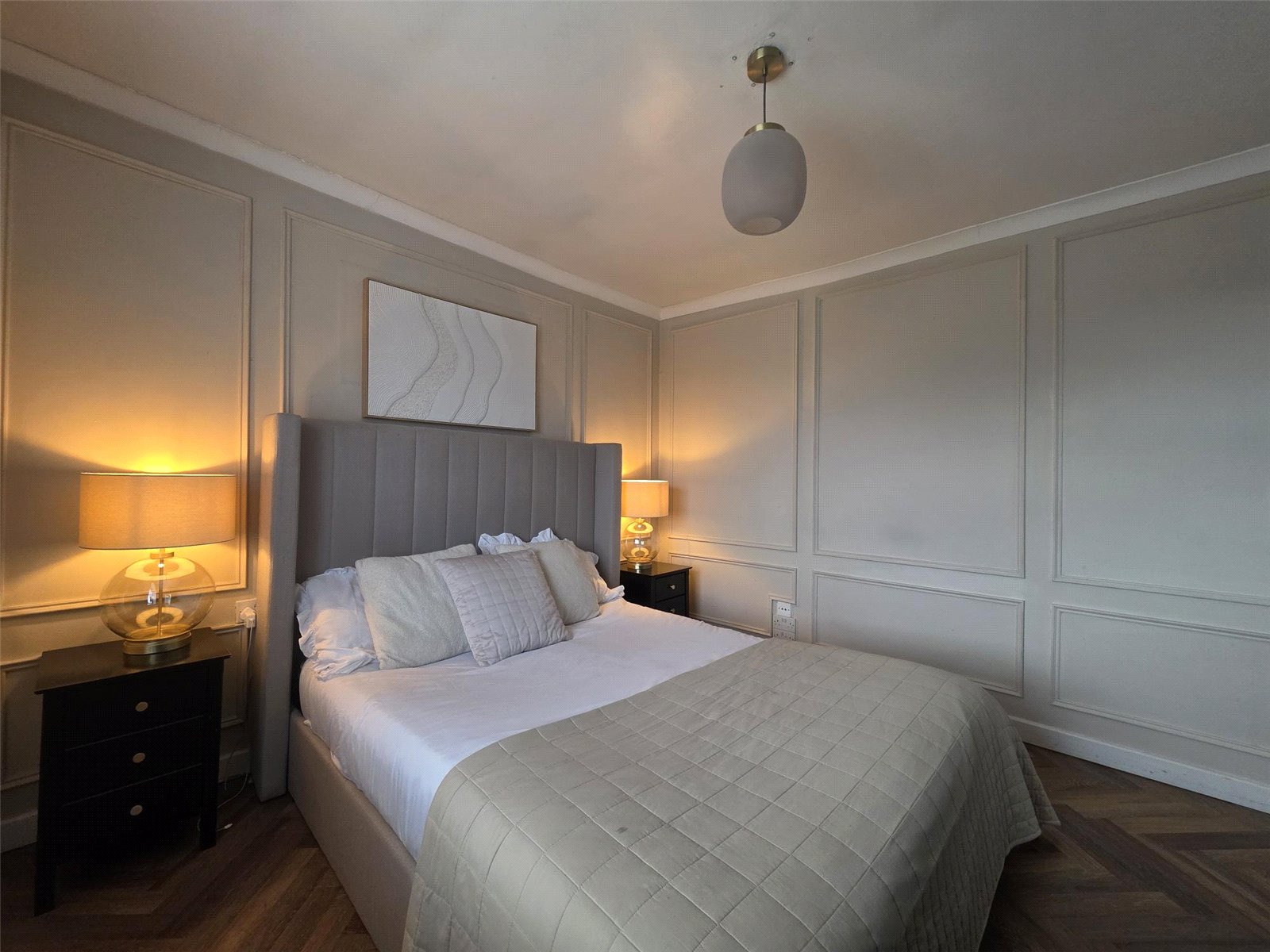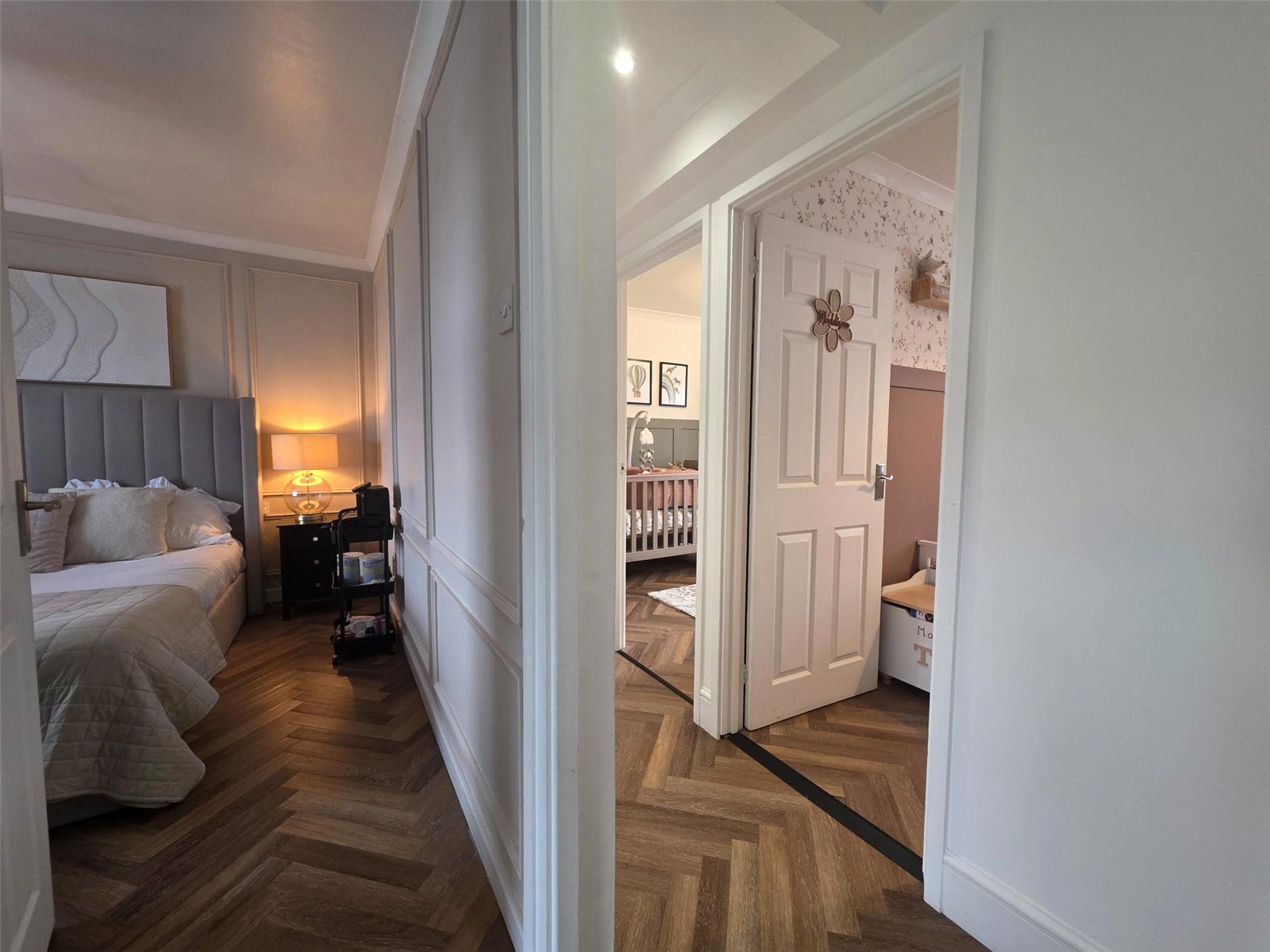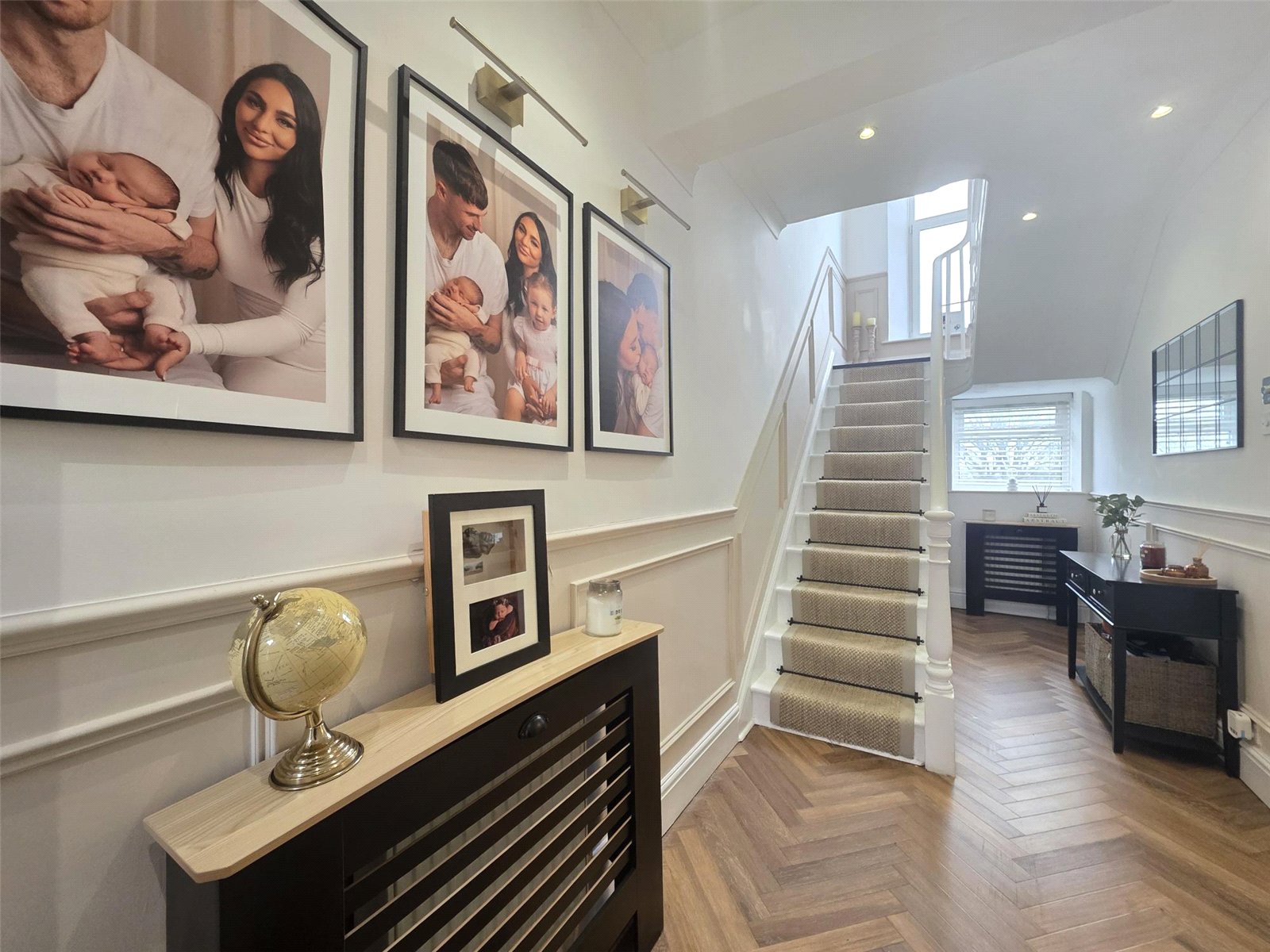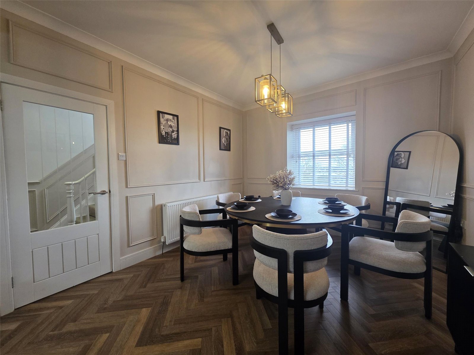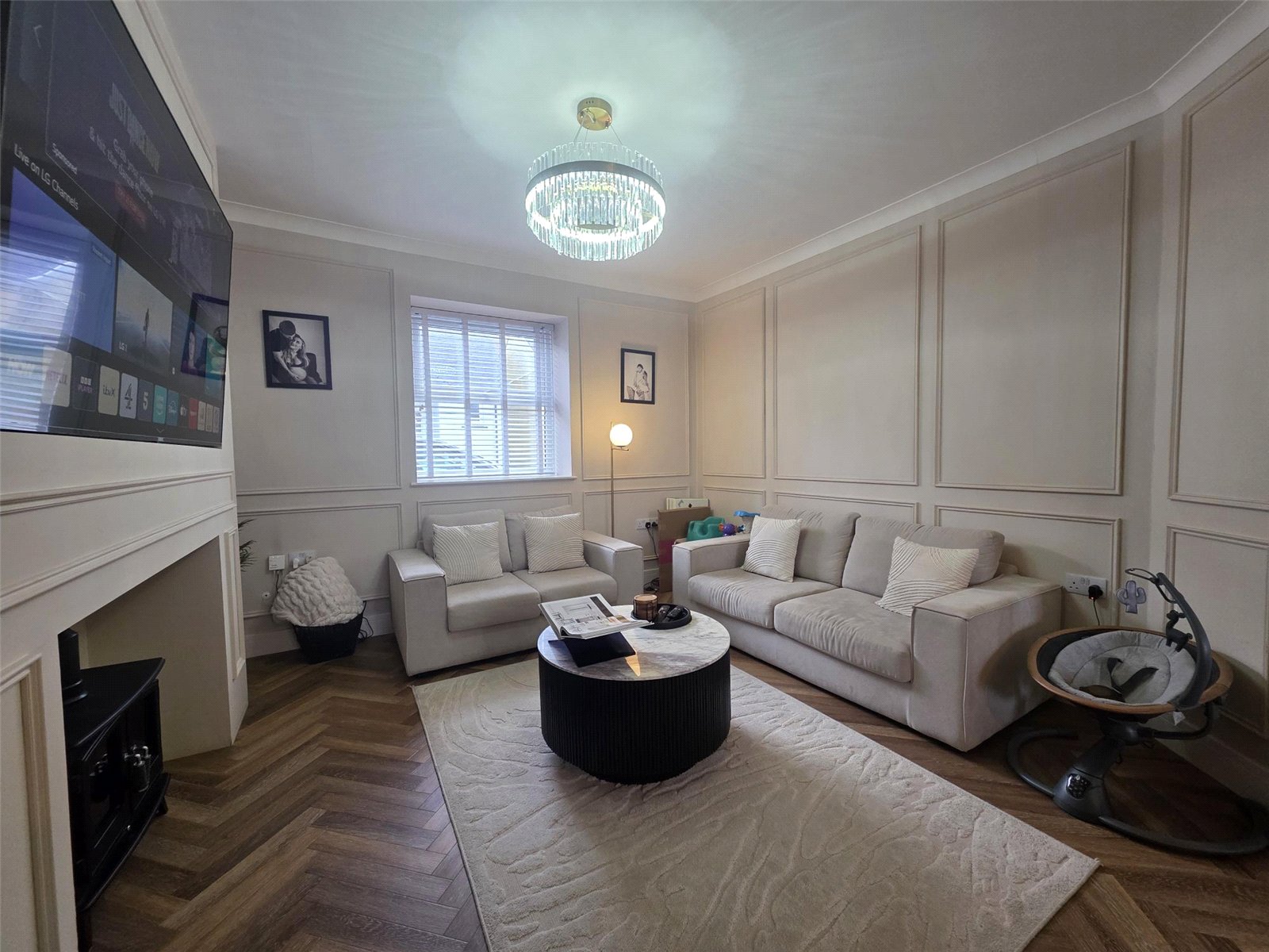 The property features a stunning kitchen where no expense has been spared — complete with high-quality built-in appliances, sleek cabinetry, and a central island perfect for family gatherings or entertaining guests. Karndean flooring flows through many rooms, adding a touch of luxury and practicality.