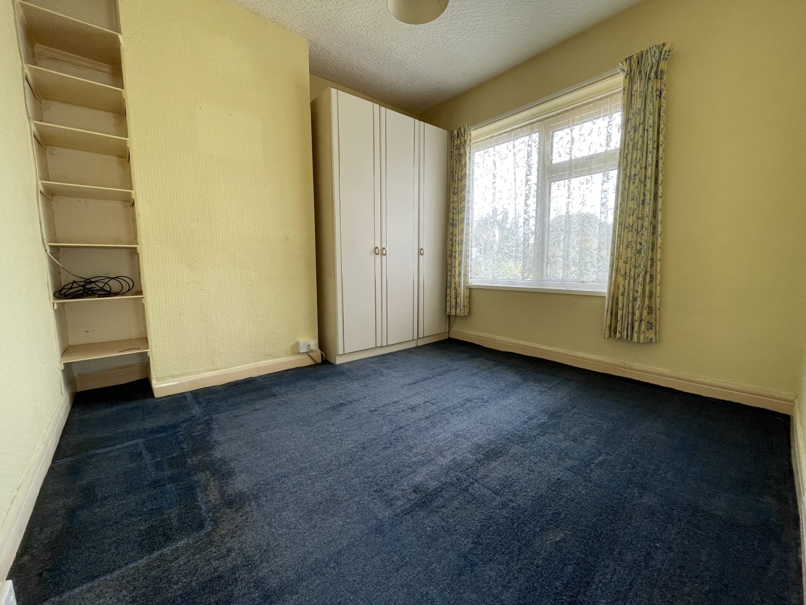 Rear-facing double bedroom, with uPVC double-glazed window, carpeted flooring & light fitting.
