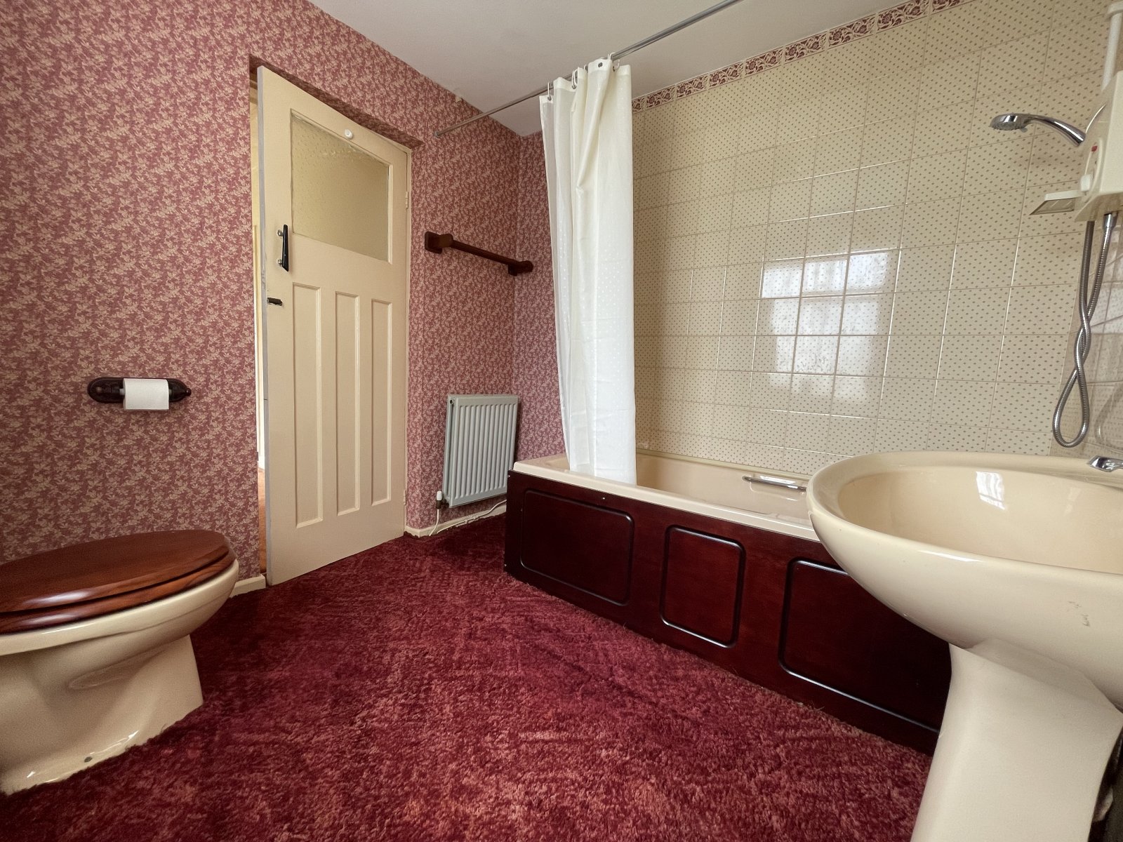 Comprising of bath with electric shower unit over, wash basin, close-coupled w/c, splashback tiling, radiator and uPVC obscure double-glazed window.