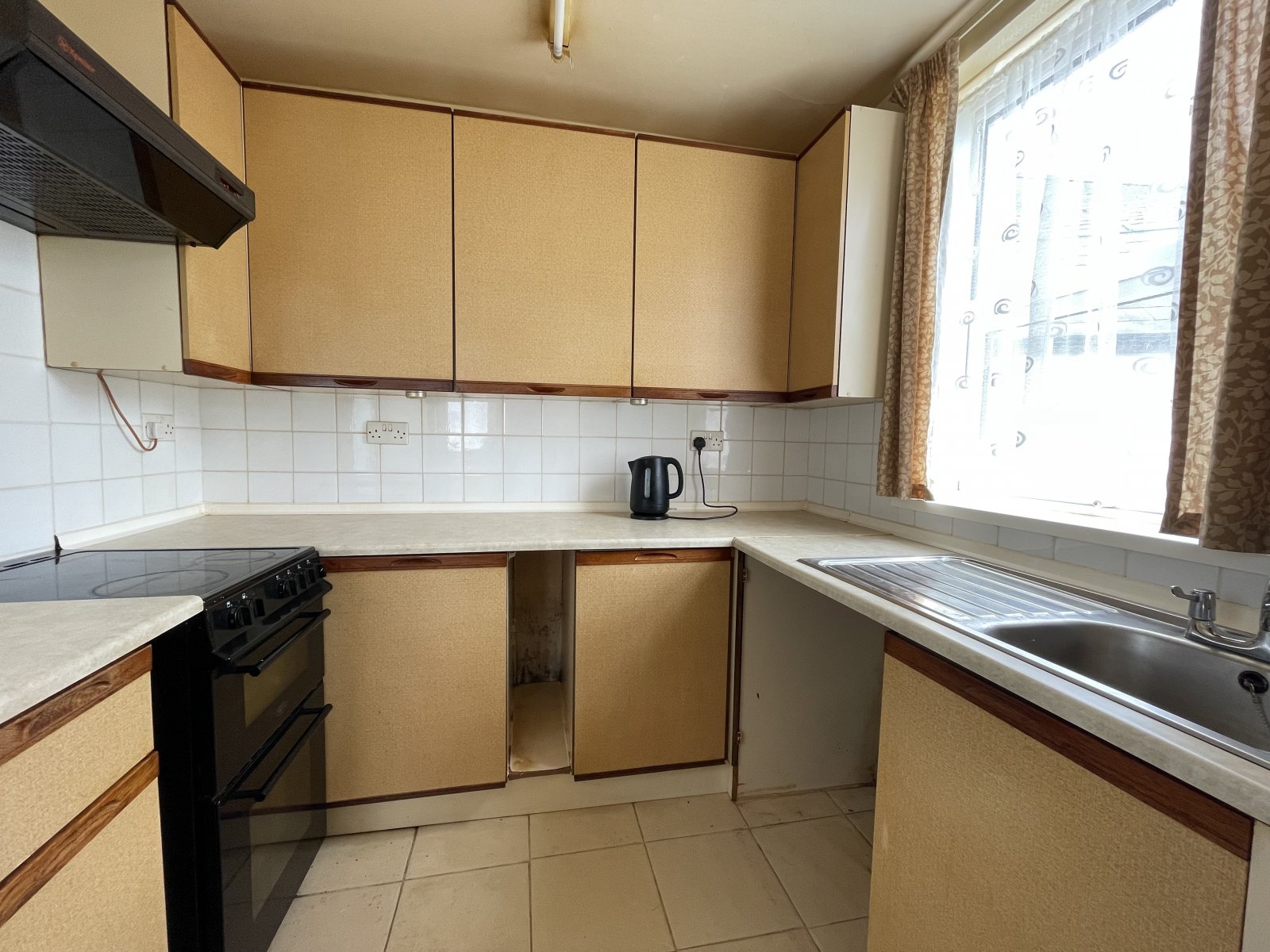 Square kitchen with base & wall units, space & plumbing for white goods, stainless steel sink & drainer with mixer tap, electric oven with extractor over, as well as tiled flooring, uPVC double-glazed window overlooking garden and uPVC double-glazed door access to garden.