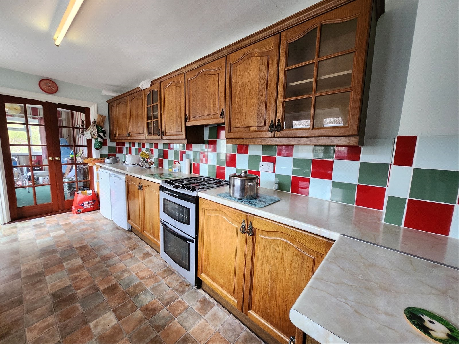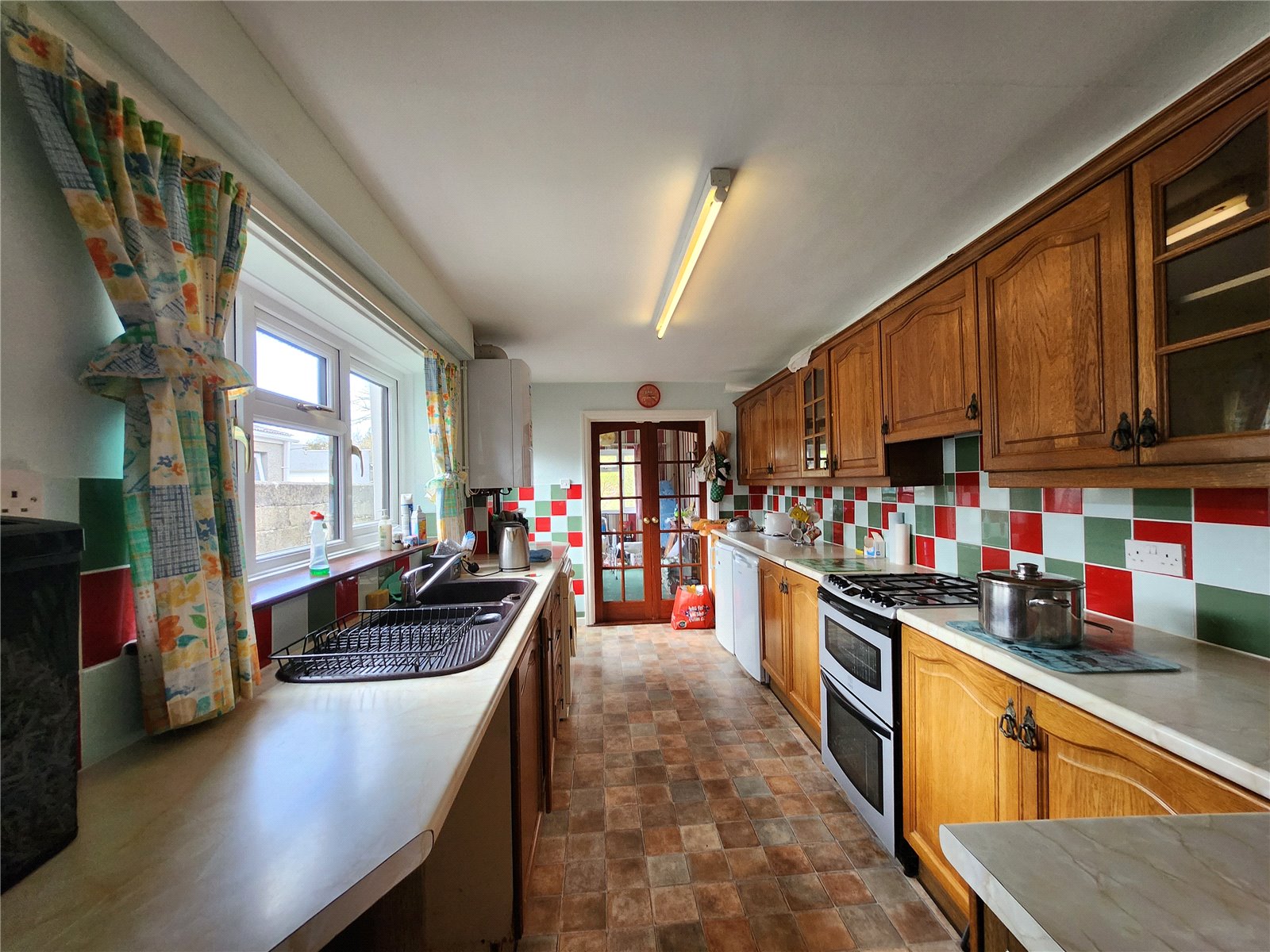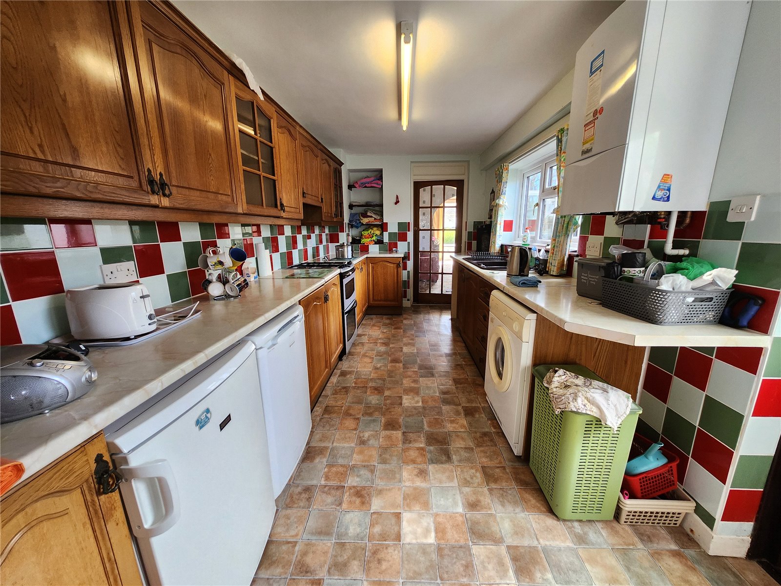 Tiled floor, selection of wall and base units with space for cooker, washer and undercounter fridge and freezer, doucle sink with mixer tap, radiator, uPVC double glazed window to side, lightfitting.