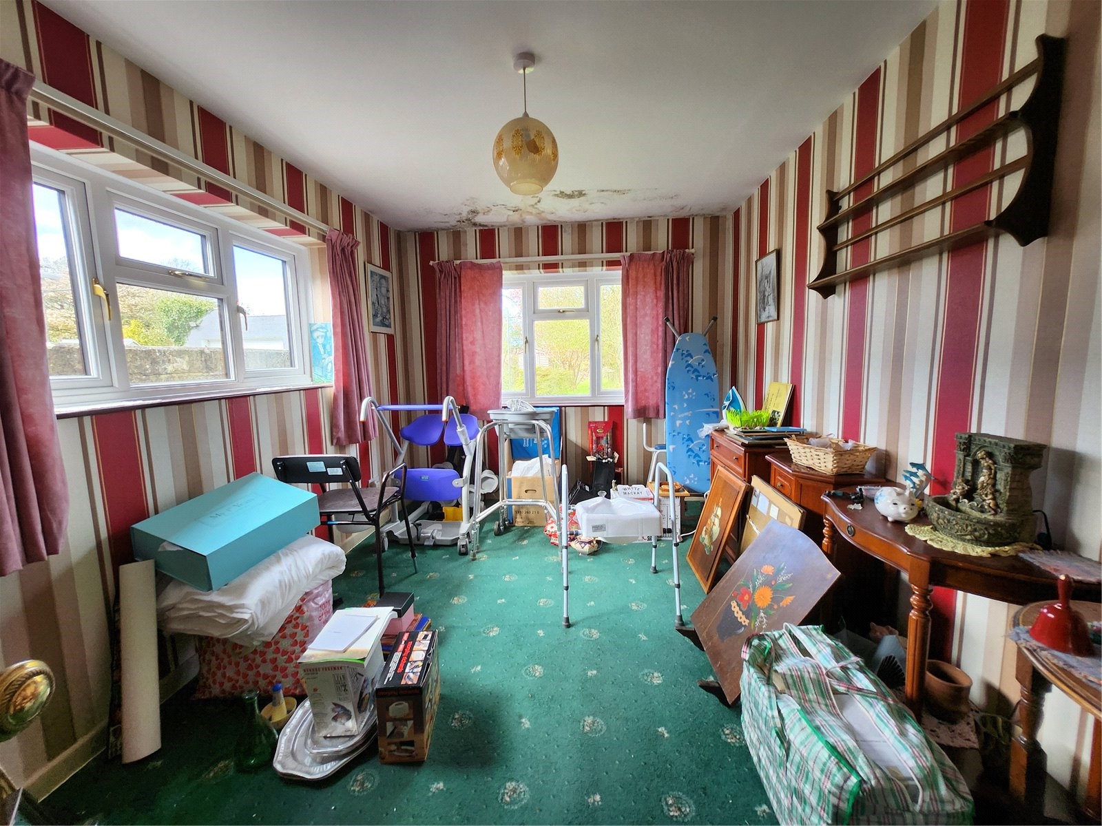 Rear-facing muti use room, with uPVC double-glazed window, carpeted flooring & light fitting.