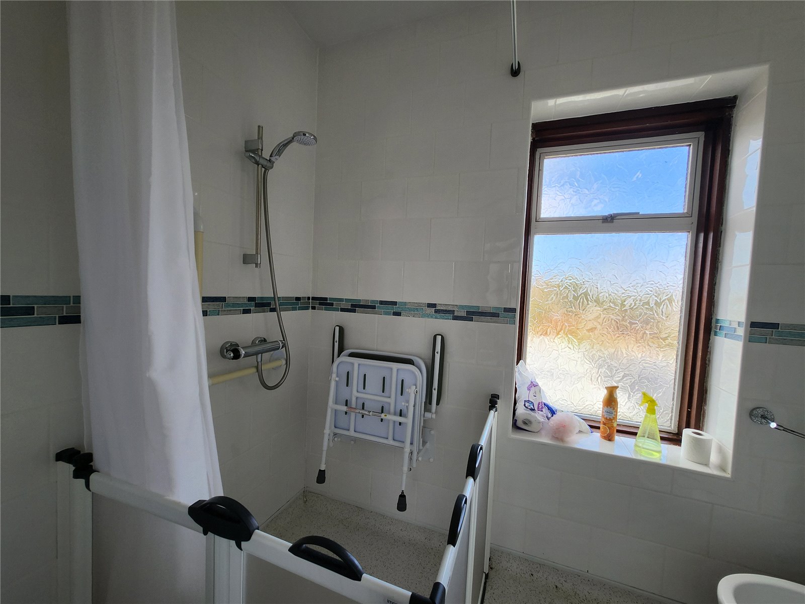 Wetroom with non - slip flooring, themastaic shower with half screen and seat, toilet,basin with chrome taps, tiled floor to celing walls, lightfitting.