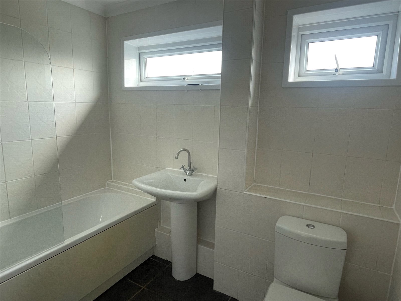 Tiled floor, fitted bath with taps, shower over bath with glass screen, heated towel rail, WC, wash hand basin with mixer tap, 2 uPVC double glazed windows with obscure glass, ceiling spot lights.