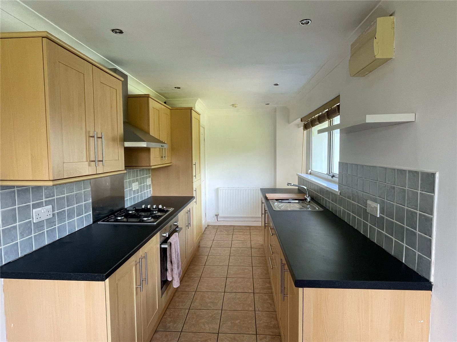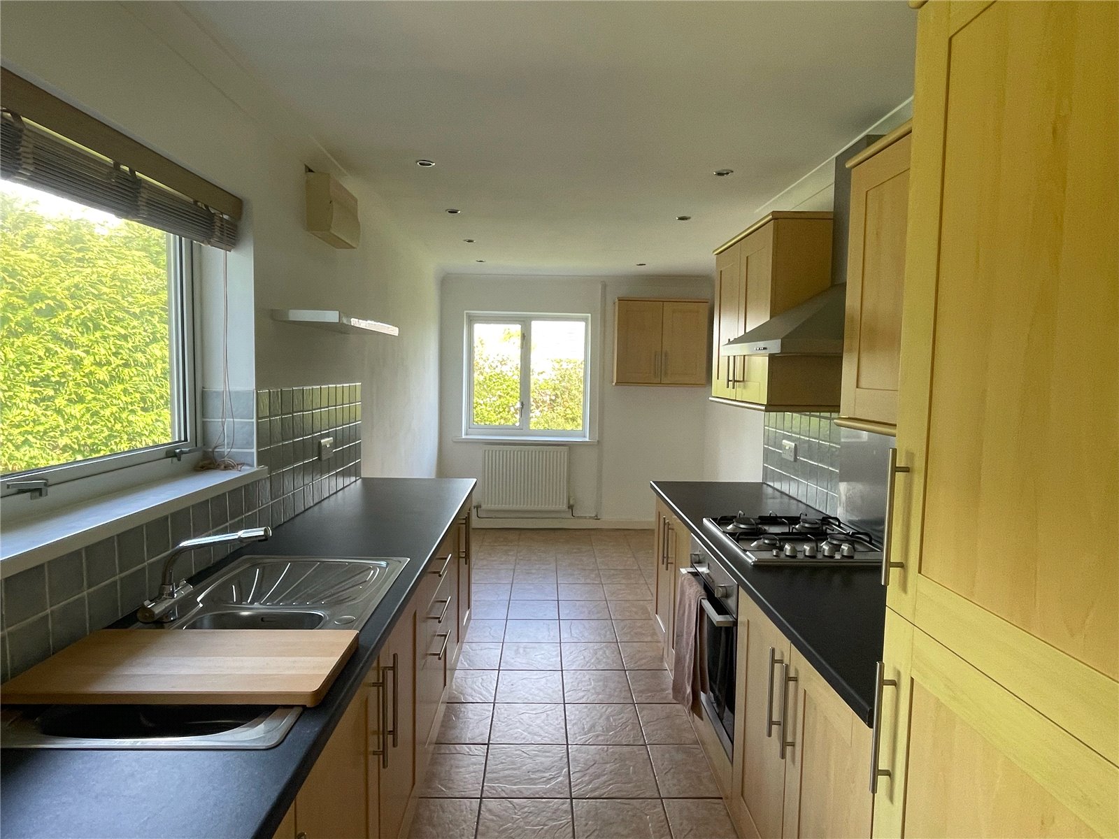 Tiled floor, 2 radiators, a range of base and wall units with integrated electric cooker and gas hob with overhead extractor, integrated fridge/freezer, ceiling spot lights, 2 uPVC double glazed windows.