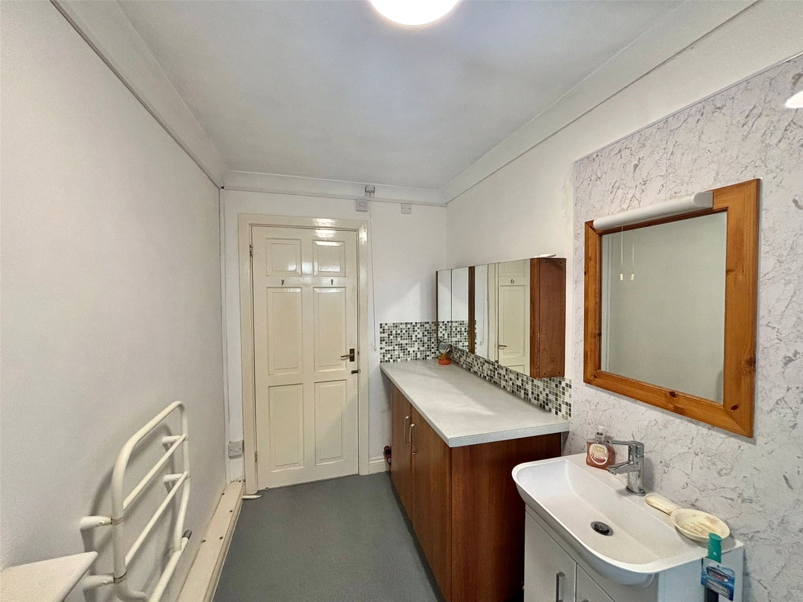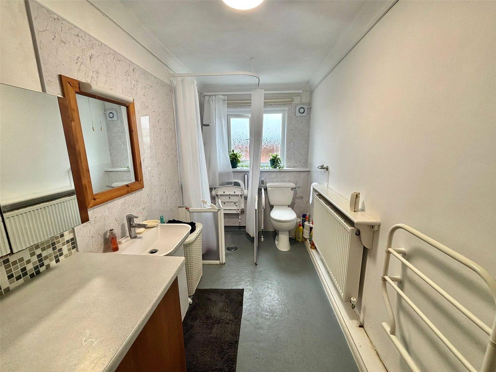This spacious and practical wet room is designed for both functionality and comfort. The generously sized space features a walk-in shower area and a large vanity with excellent built-in storage. This well-appointed room offers a practical and accessible layout, with a non-slip floor for peace of mind.