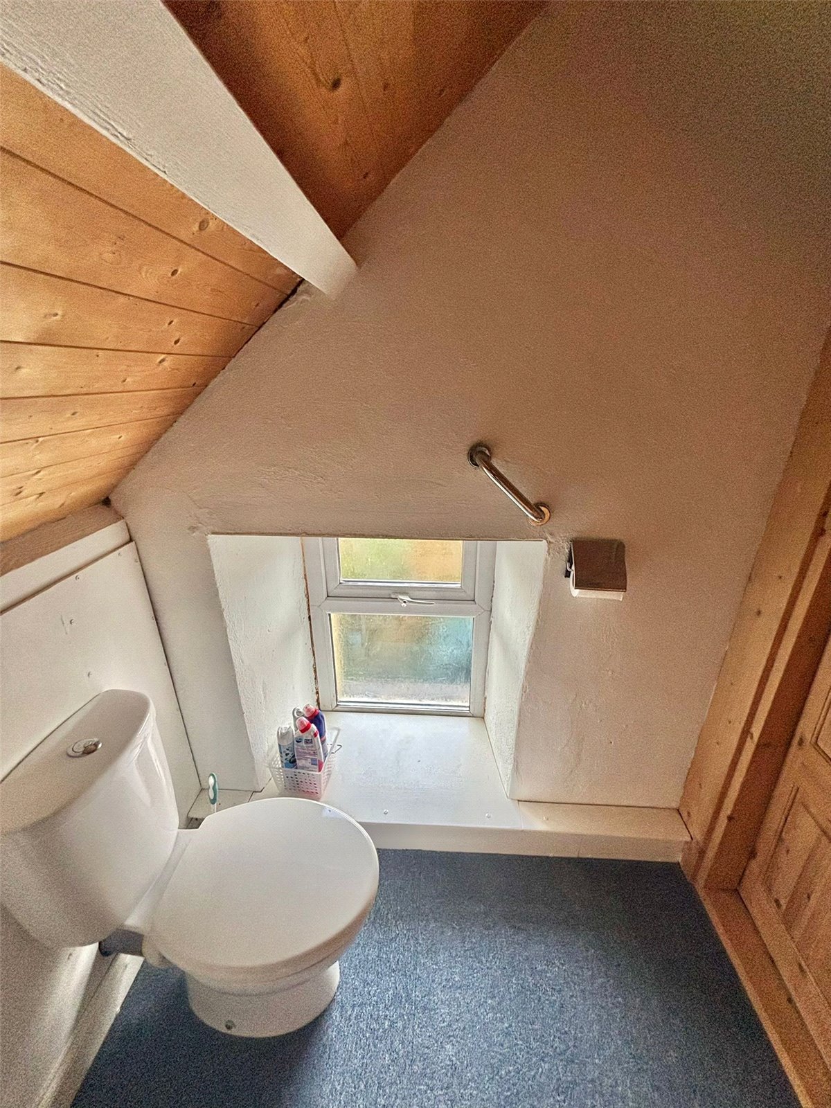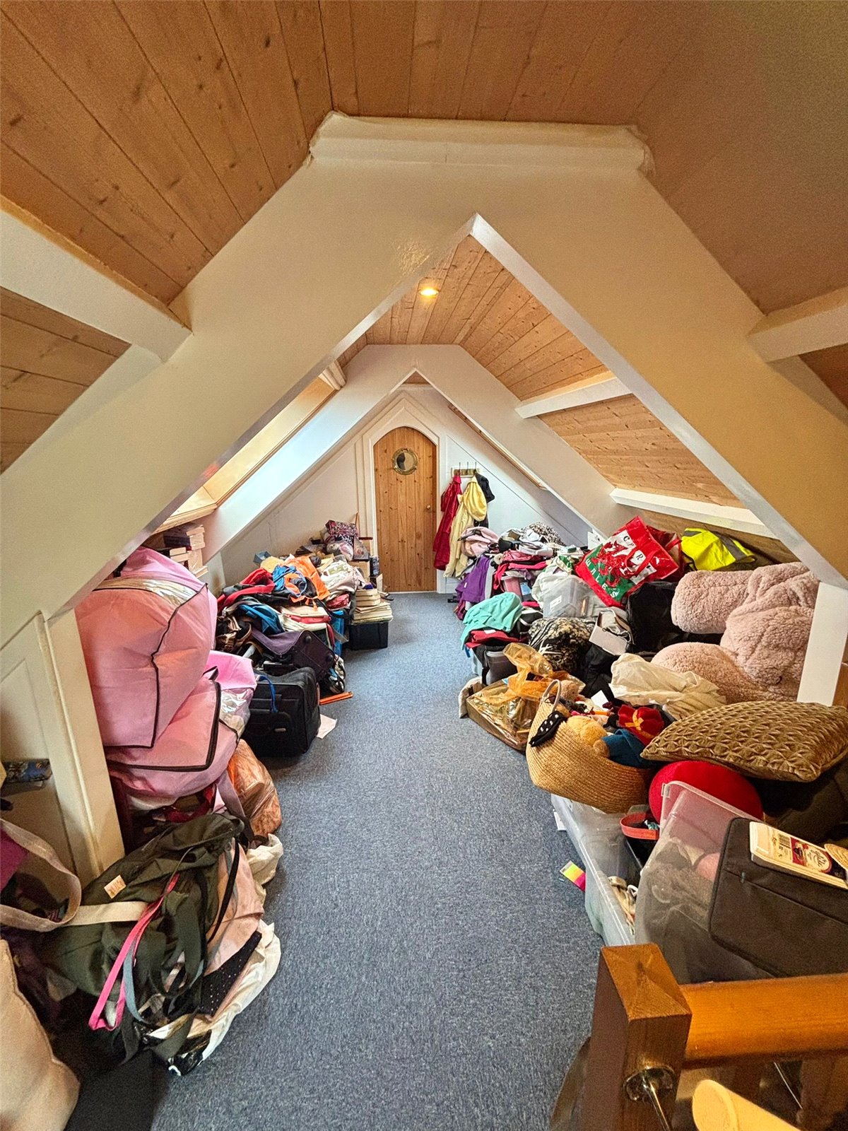 This property features a unique loft space with a vaulted, wood-paneled ceiling and exposed beams, creating a sense of rustic charm. The room is carpeted in a neutral blue, and a low door and small window at one end provide natural light and access.
