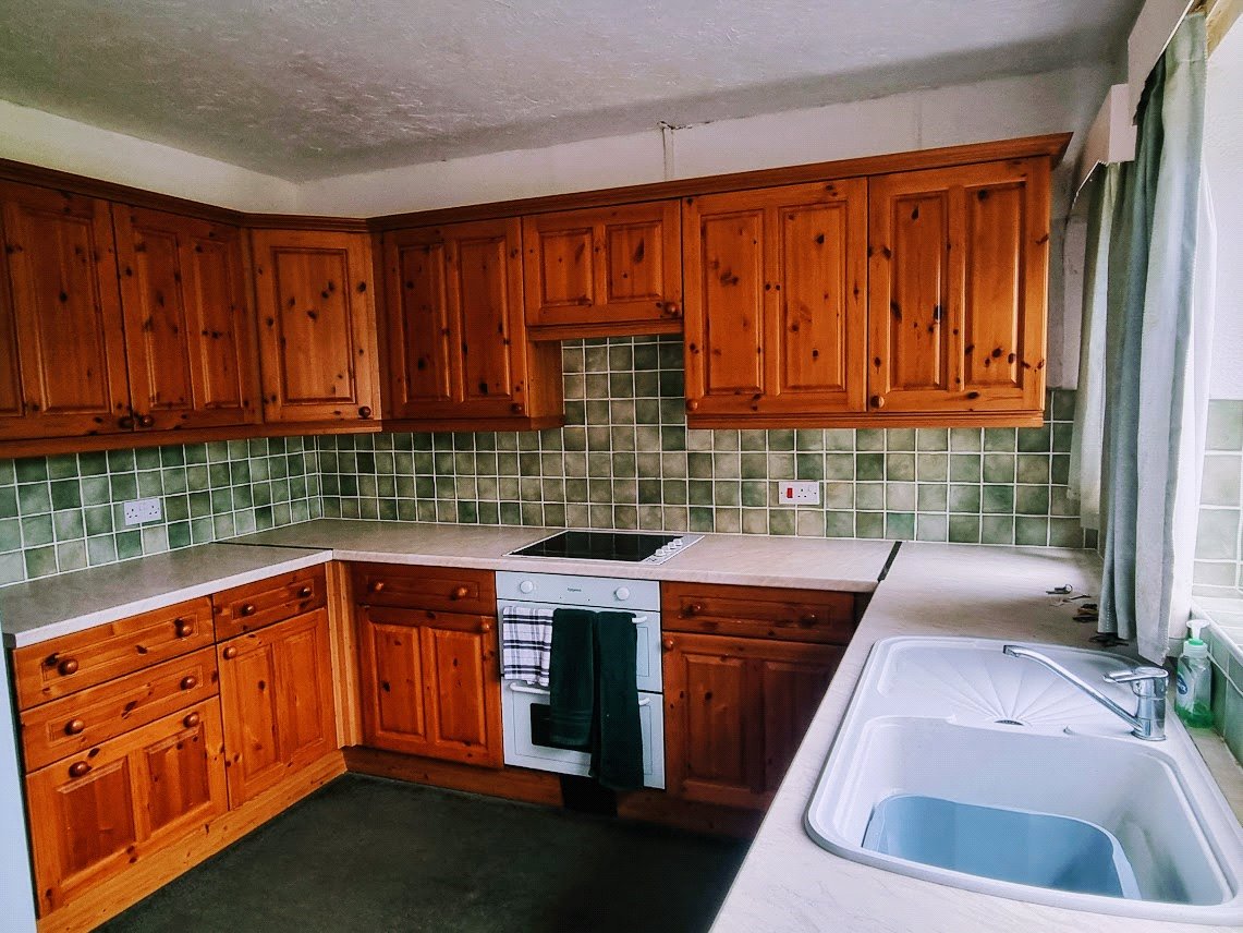 Carpeted floor, radiator, range of base units with sink, drainer and mixer tap, inergrated oven with electric hob and tiled splash back, room for washing machine and fridge freezer, 2 uPVC single glazed windows to rear one with obscured glass, ceiling light.