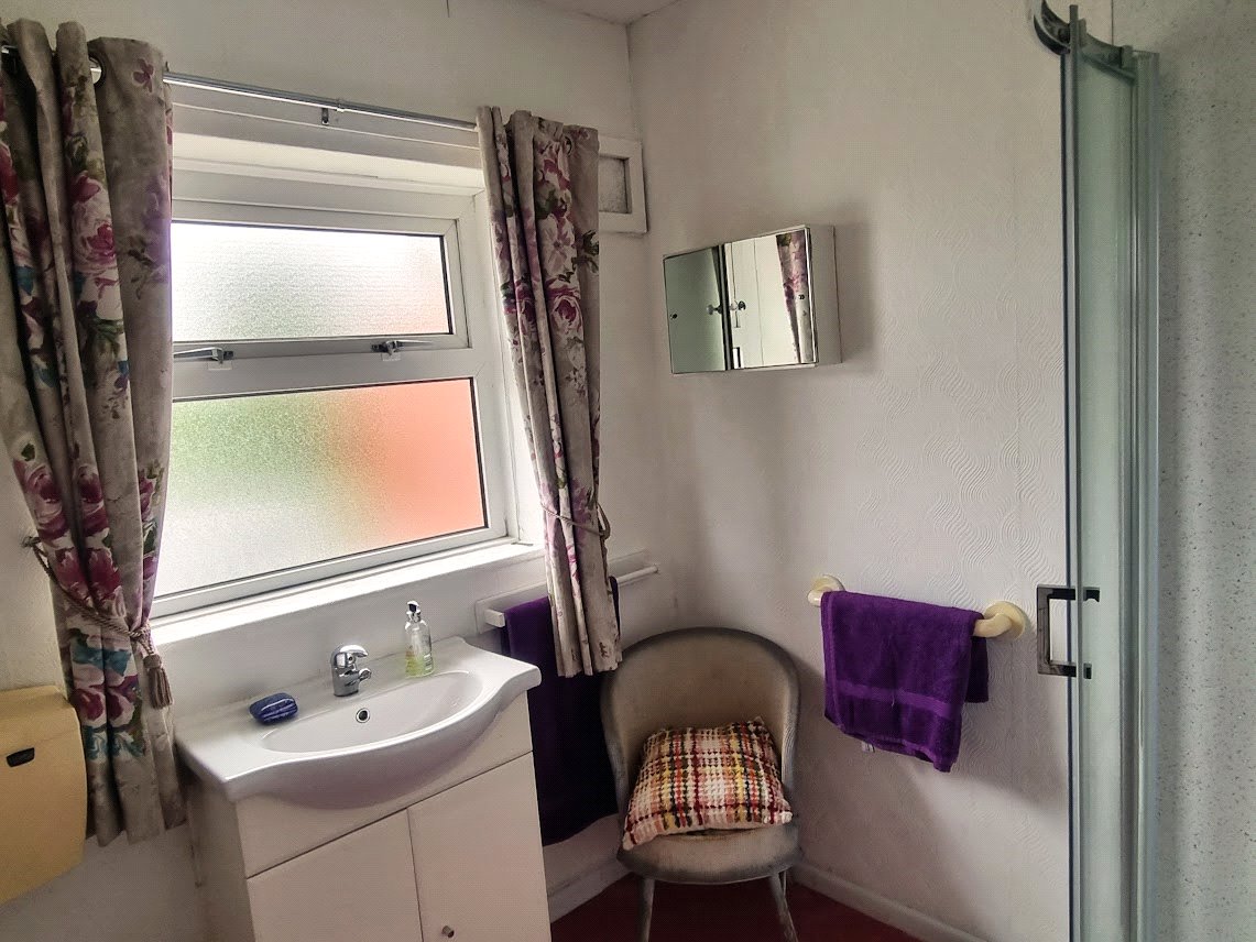 Obscure uPVC single glazed window to rear, radiator, W/C, wash hand basin on vanity with mixer tap, bathroom cabinet, corner shower cubicle with sliding glass doors and wall mounted shower,celing light.