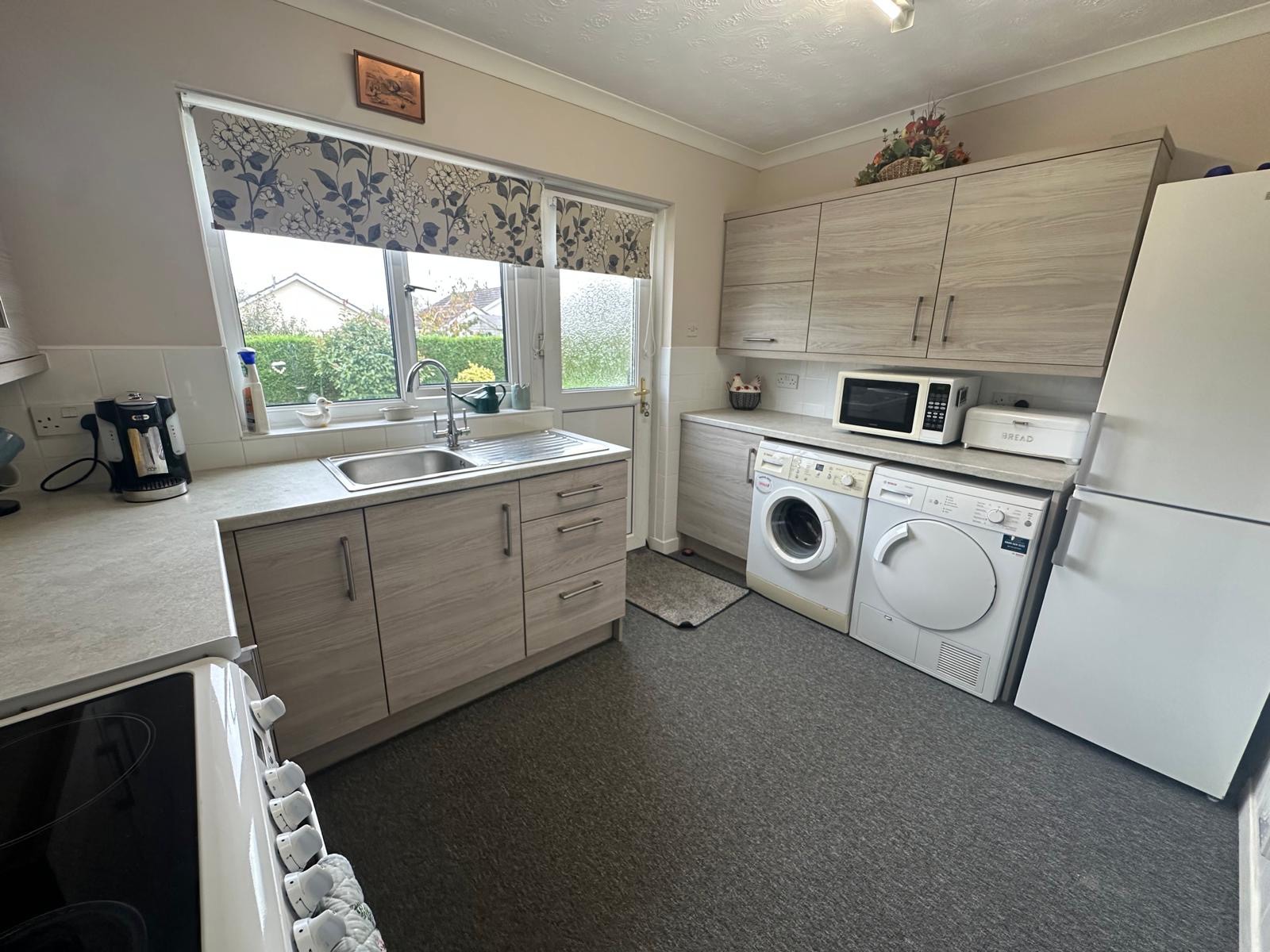 Partially glazed obscured door leading to rear garden, UPVC double glazed window, all and base mount units, space for washer, dryer, fridge and electric oven, electric extractor fan, grey marble effect surface tops, stainless steel sink and drainer with mixer tap, boiler, carpet.