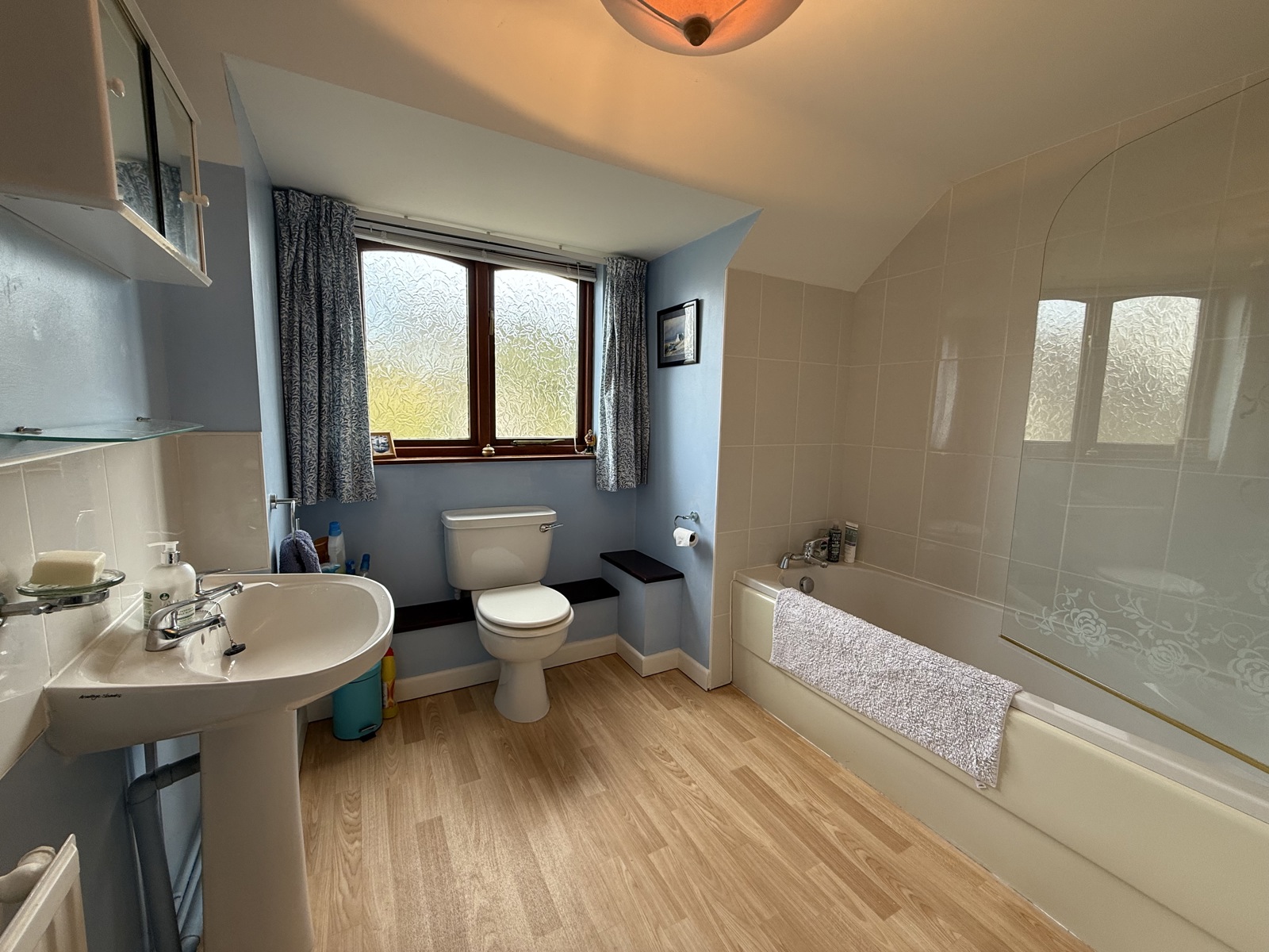 Double glazed window to side, bath with electric shower over and glass screen, pedestal wash hand basin, wc, radiator, airing cupboard with shelving and hot water tank.