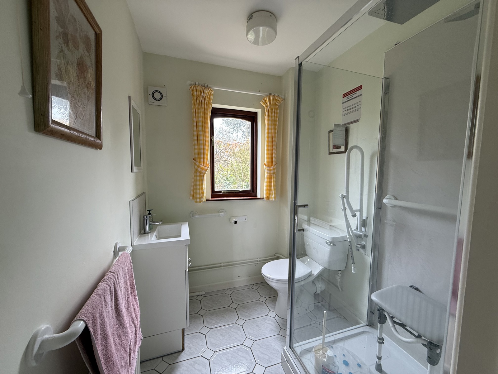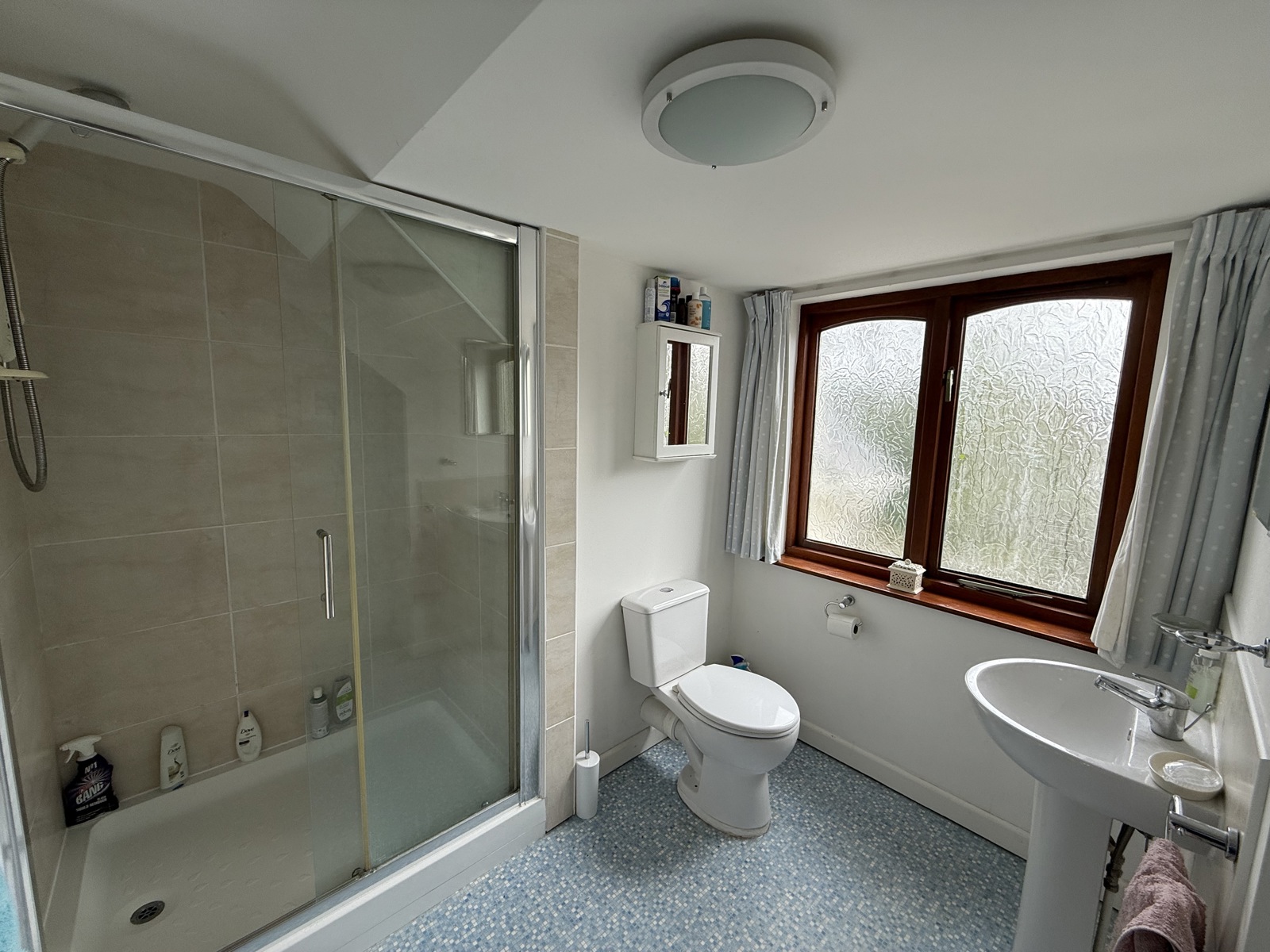 Wooden double glazed window to side, wc, wash hand basin, tiled flooring, shower cubicle with folding screen, radiator.