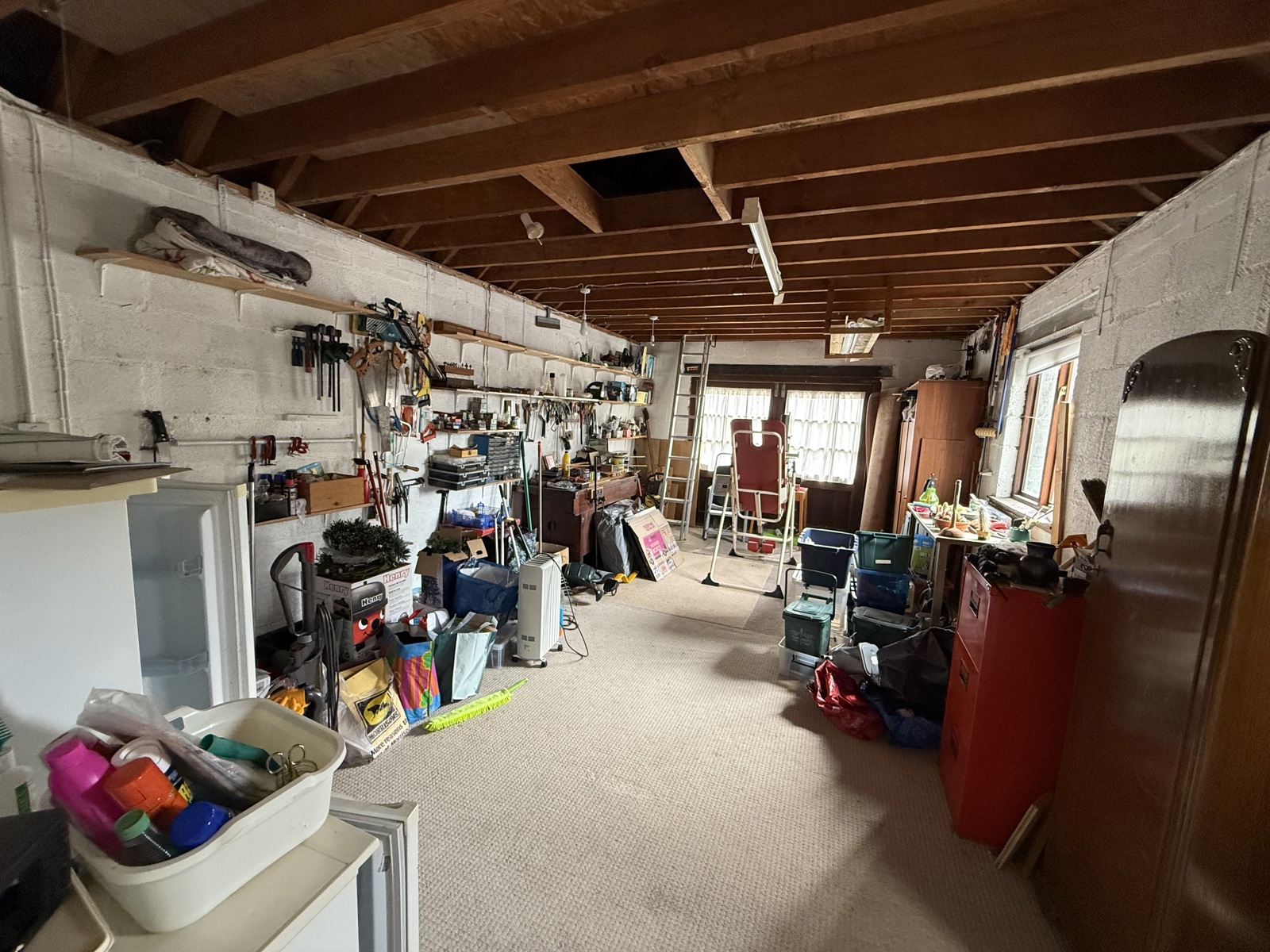 Wooden double doors to fore, door to side, window to side, roof space, space for freezer, oil fired Worcester boiler, electric and lighting.