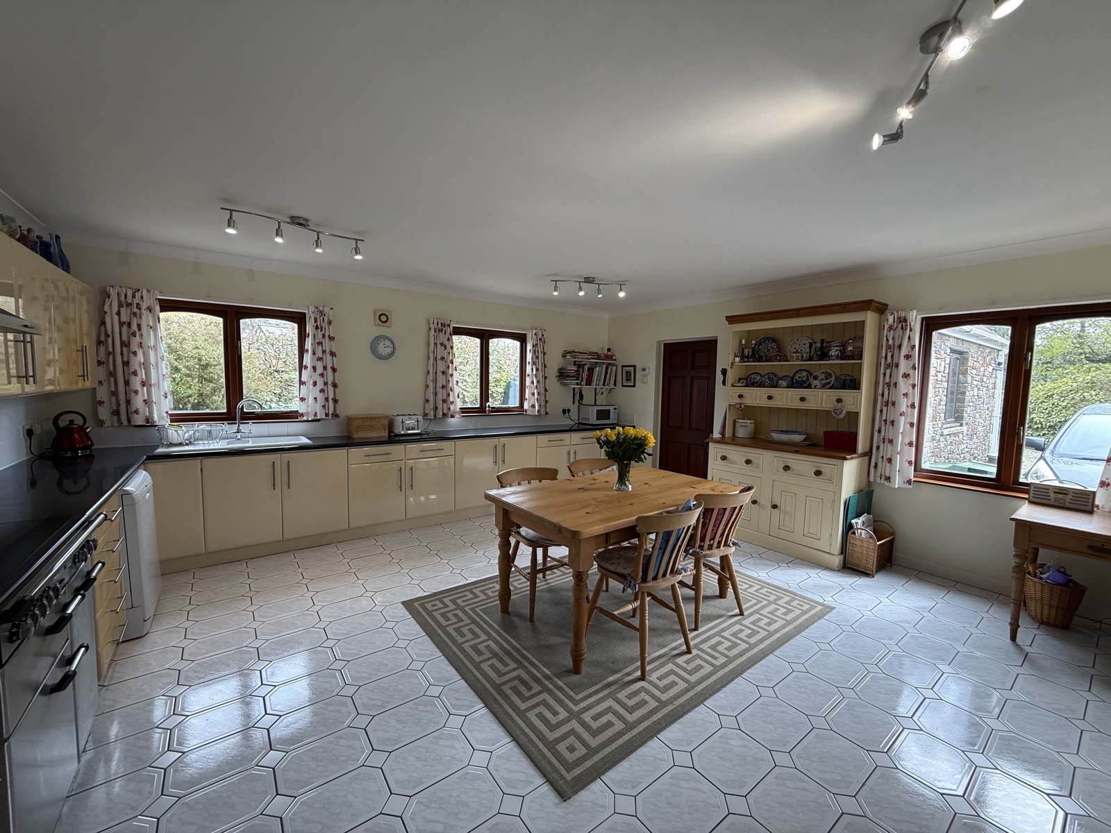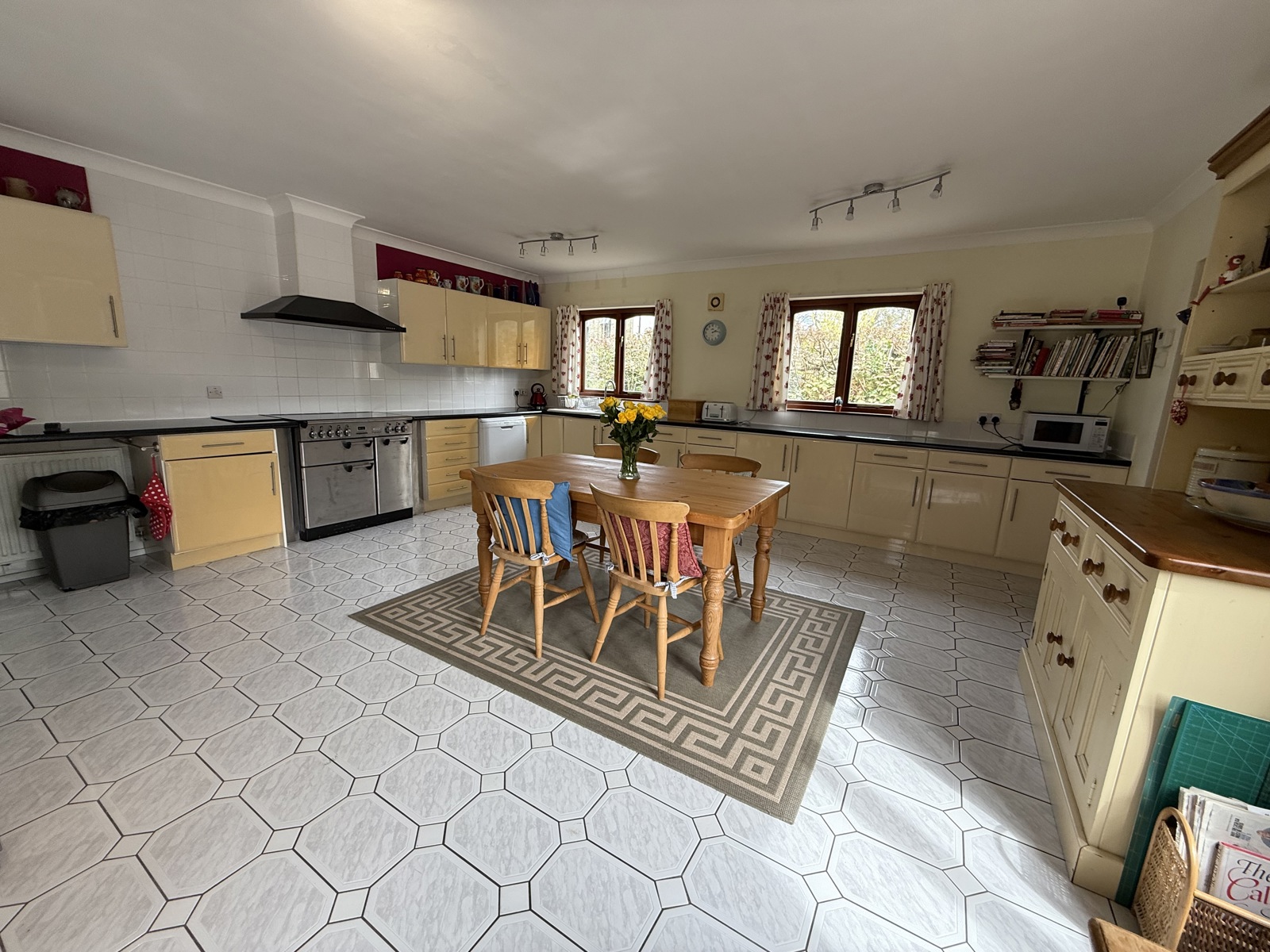 Three double glazed windows to side, double glazed window to fore, tiled flooring, two radiators, matching wall and base units with worktop space over, one and a half bowl single drainer sink unit, plumbing for dishwasher, electric oven and hob with extractor hood over, thermostat and controls for heating system, door to: