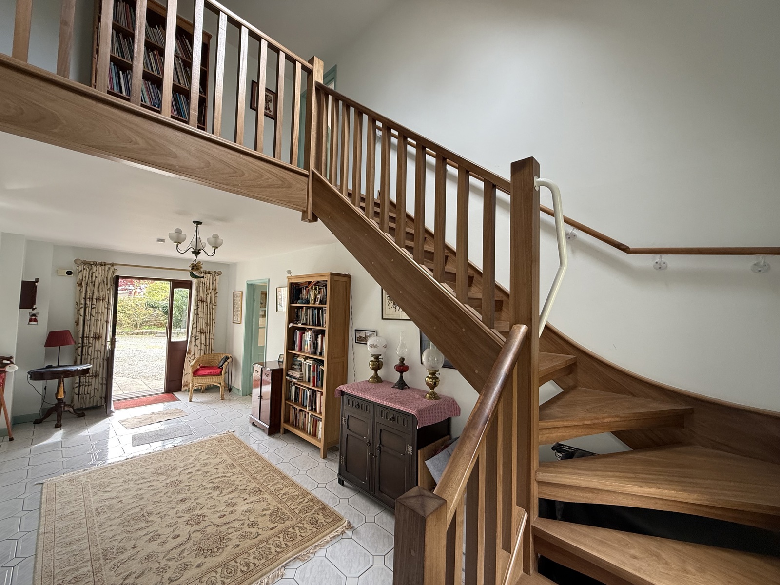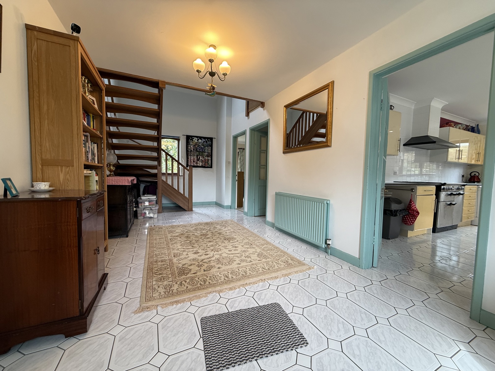 Wooden front door, windows to side, tiled flooring, double radiator, stairs to first floor, double glazed window to rear, door to: