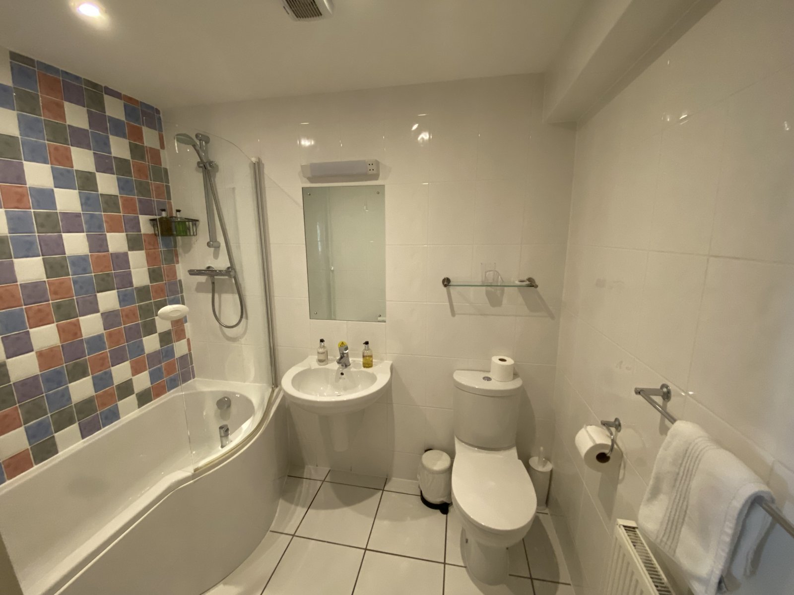 Fully tiled walls and floor, wash hand basin, wc, p-shaped panelled bath with shower over and glass screen, radiator, towel rail. wall mounted mirror, shaver point and light, extractor, ceiling spotlights.