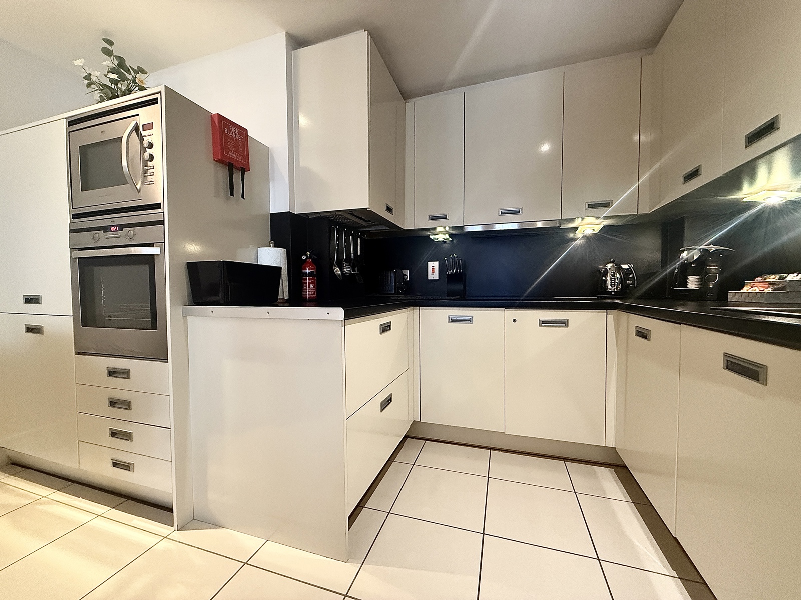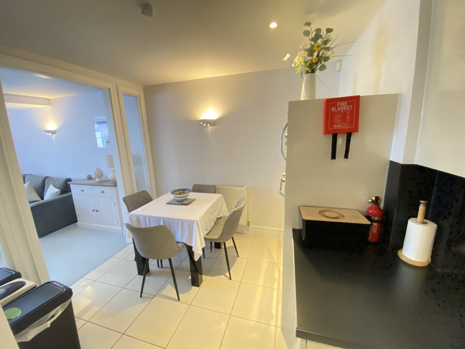 Glass panelling from lounge, range of wall and base units with complimenting worktop and matching splashbacks, inset 1.5 bowl sink and drainer with mixer tap, tiled flooring, space and plumbing for concealed washing machine, built-in fridge/freezer, built-in dishwasher, electric hob with extractor over, eye level oven and microwave, radiator.