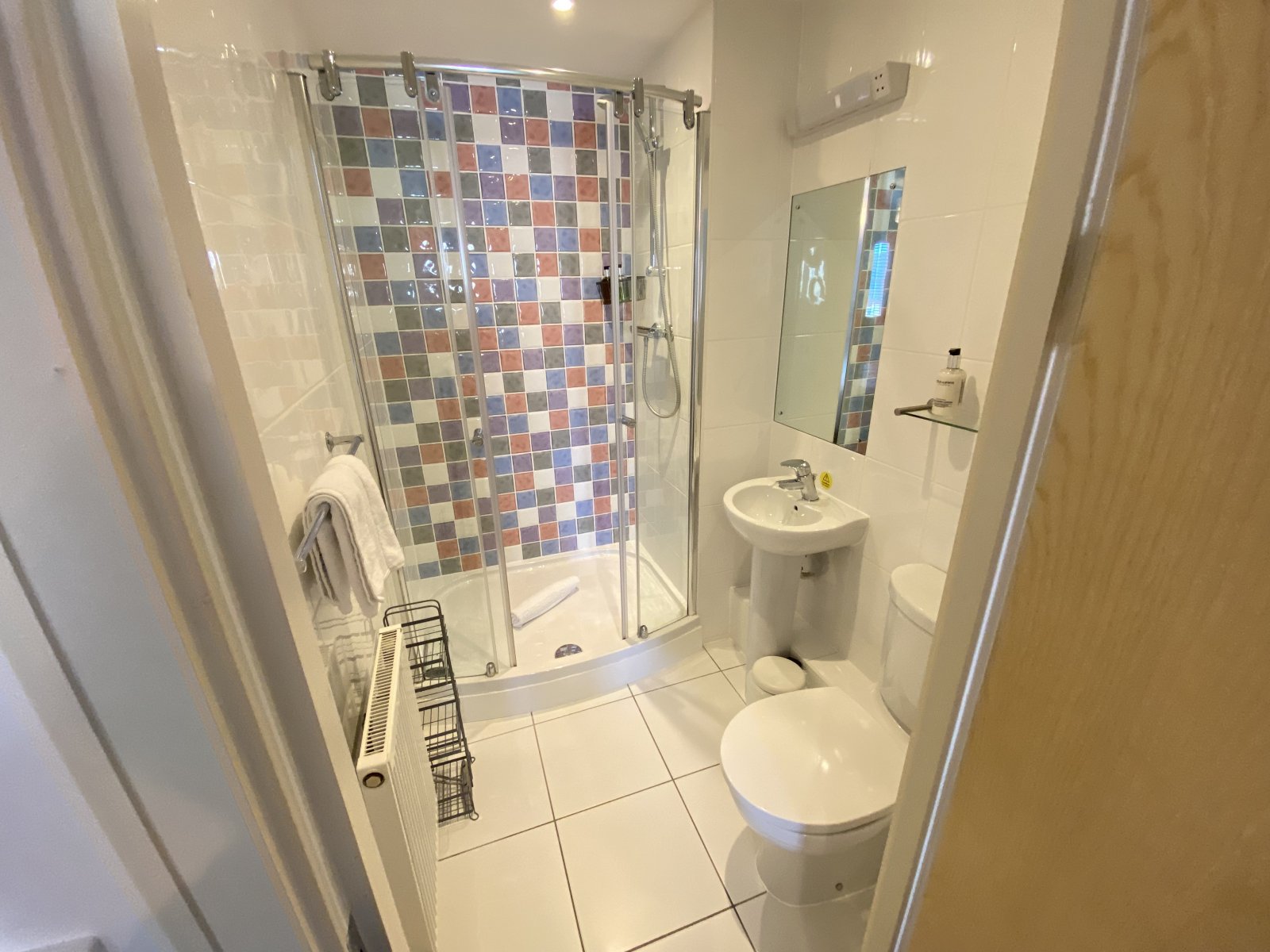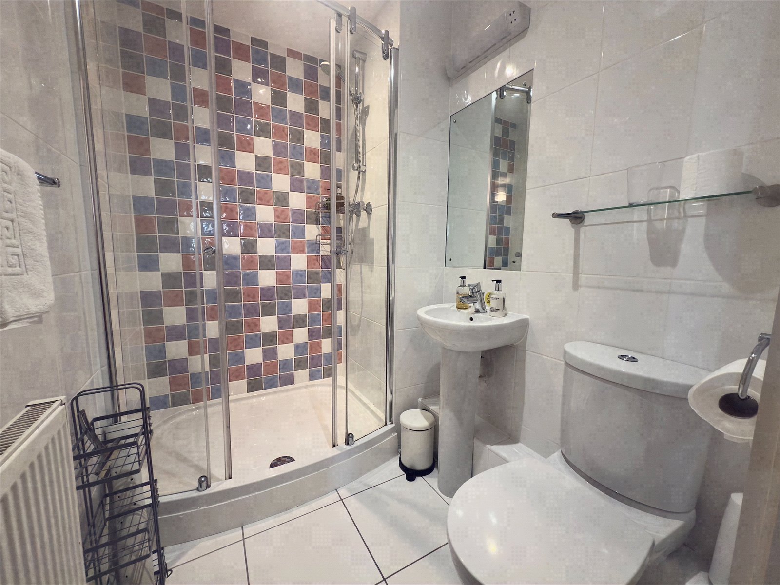 Fully tiled walls and tiled floor, wc, wash hand basin, walk-in shower cubicle with shower fitted and glass shower doors, radiator, extractor.