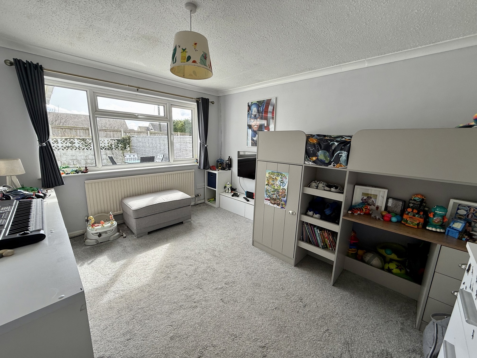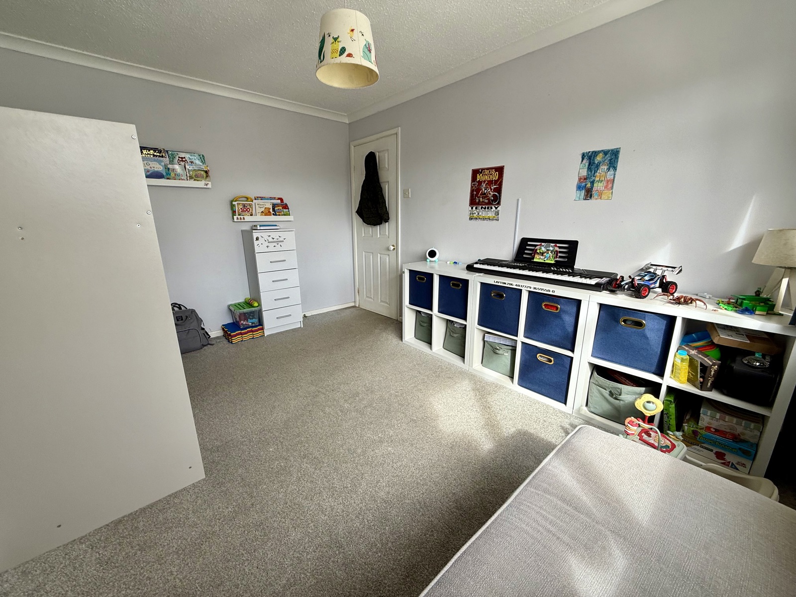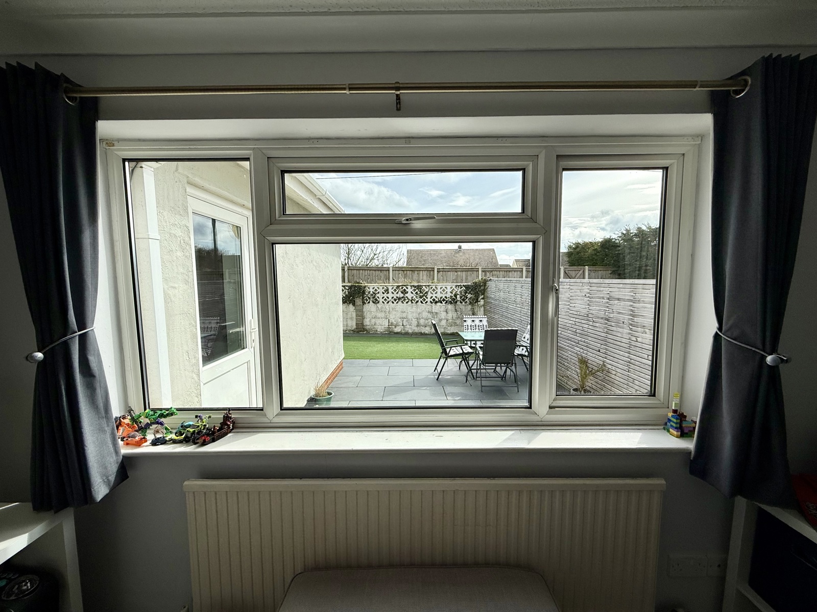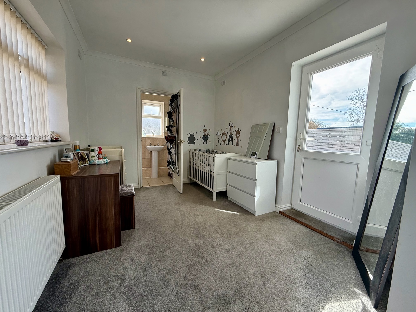Carpet, uPVC double glazed window to the side of the property, and a uPVC glass paneled door to access the garden.