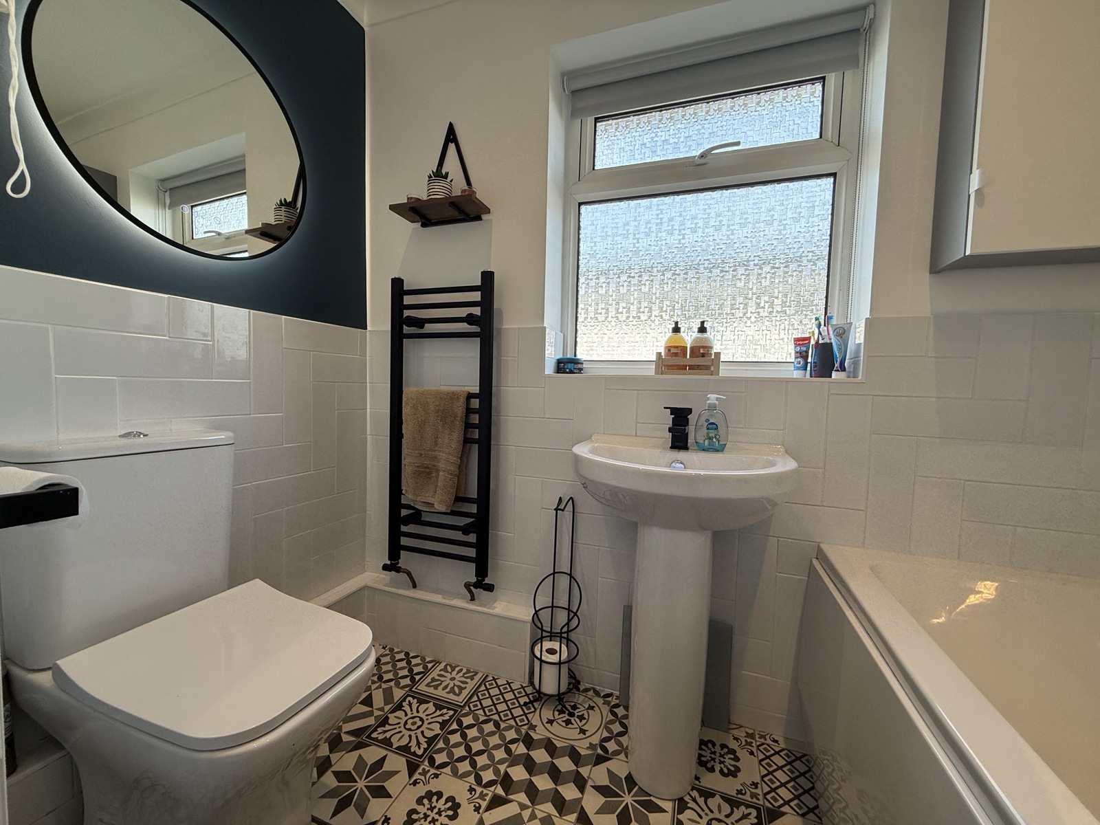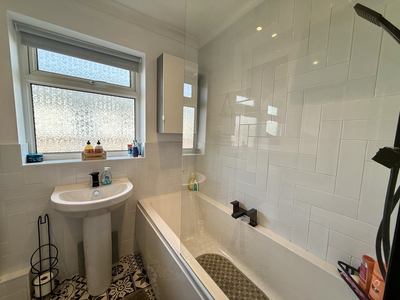 Tiled flooring, toilet, wash basin, bath with overhead shower, with a uPVC double-glazed frosted window on the side.