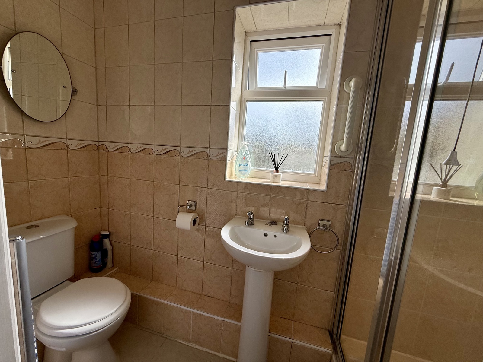 Fully tiled with toilet, pedestal, hand basin, and a shower cubicle