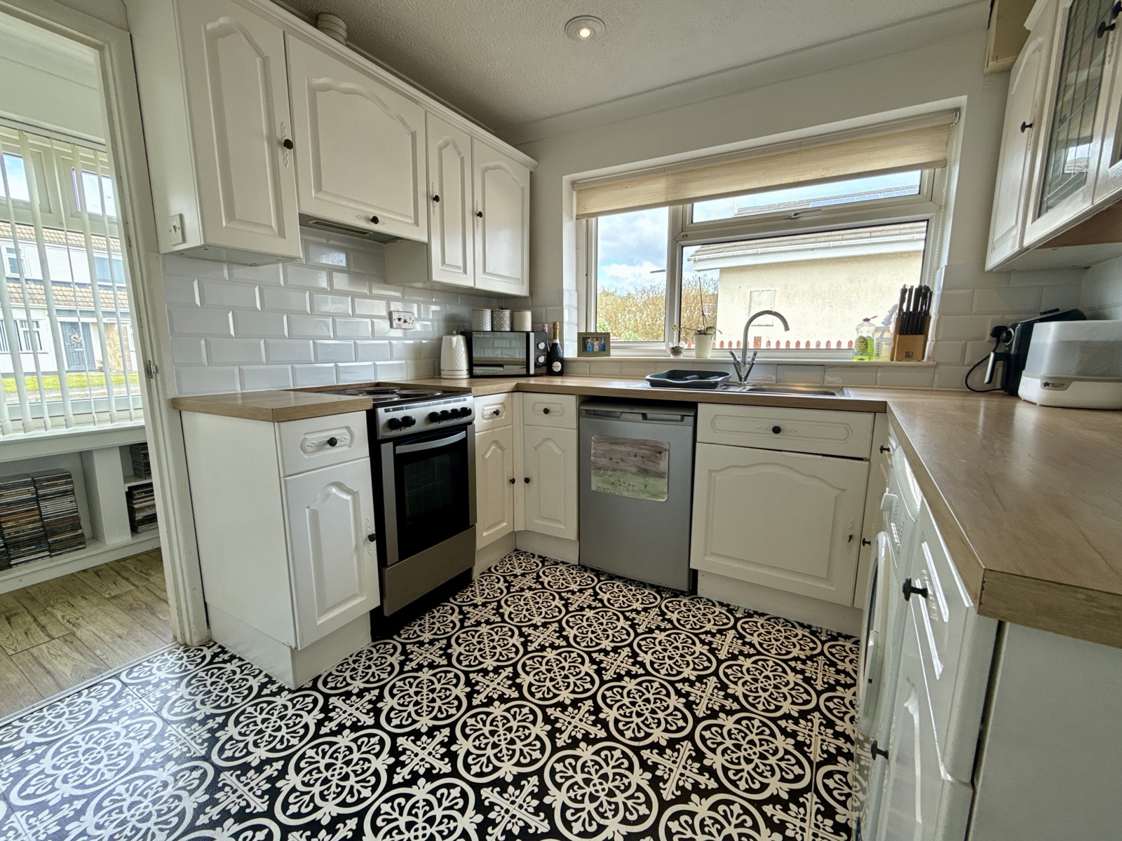 Vinyl flooring, matching base and wall units, tiled splashback, and a uPVC double-glazed window on the side.