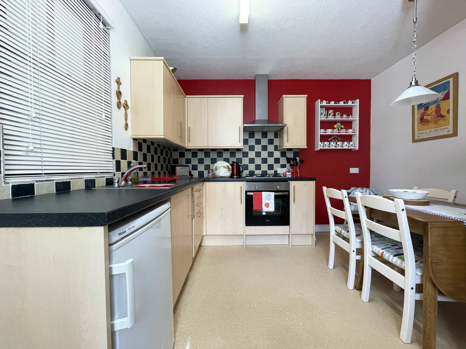 Laminate flooring, range of base and eye level units, sink and drainer, electric oven, gas hob, tile splashback, radiator, double glazed uPVC window to side.