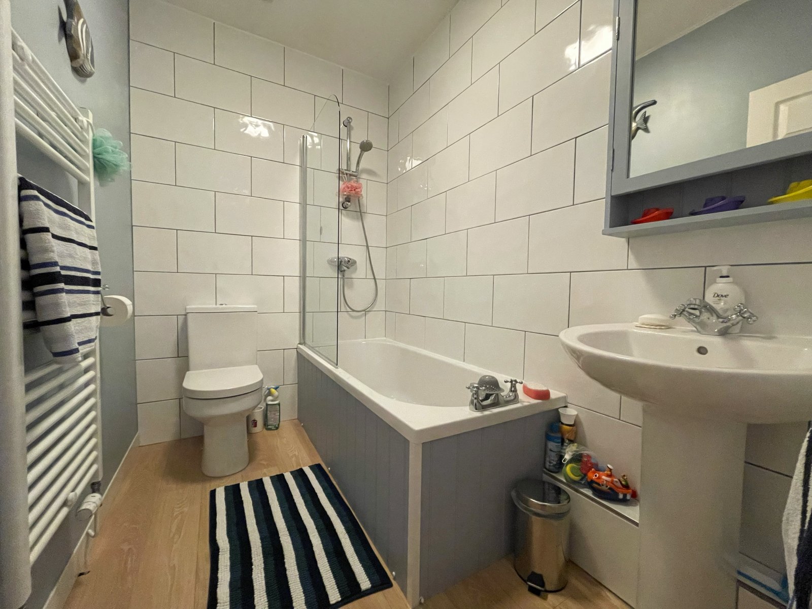 Vinyl flooring, wash hand basin, WC, bath with shower over, fully tiled walls, heated towel rail.