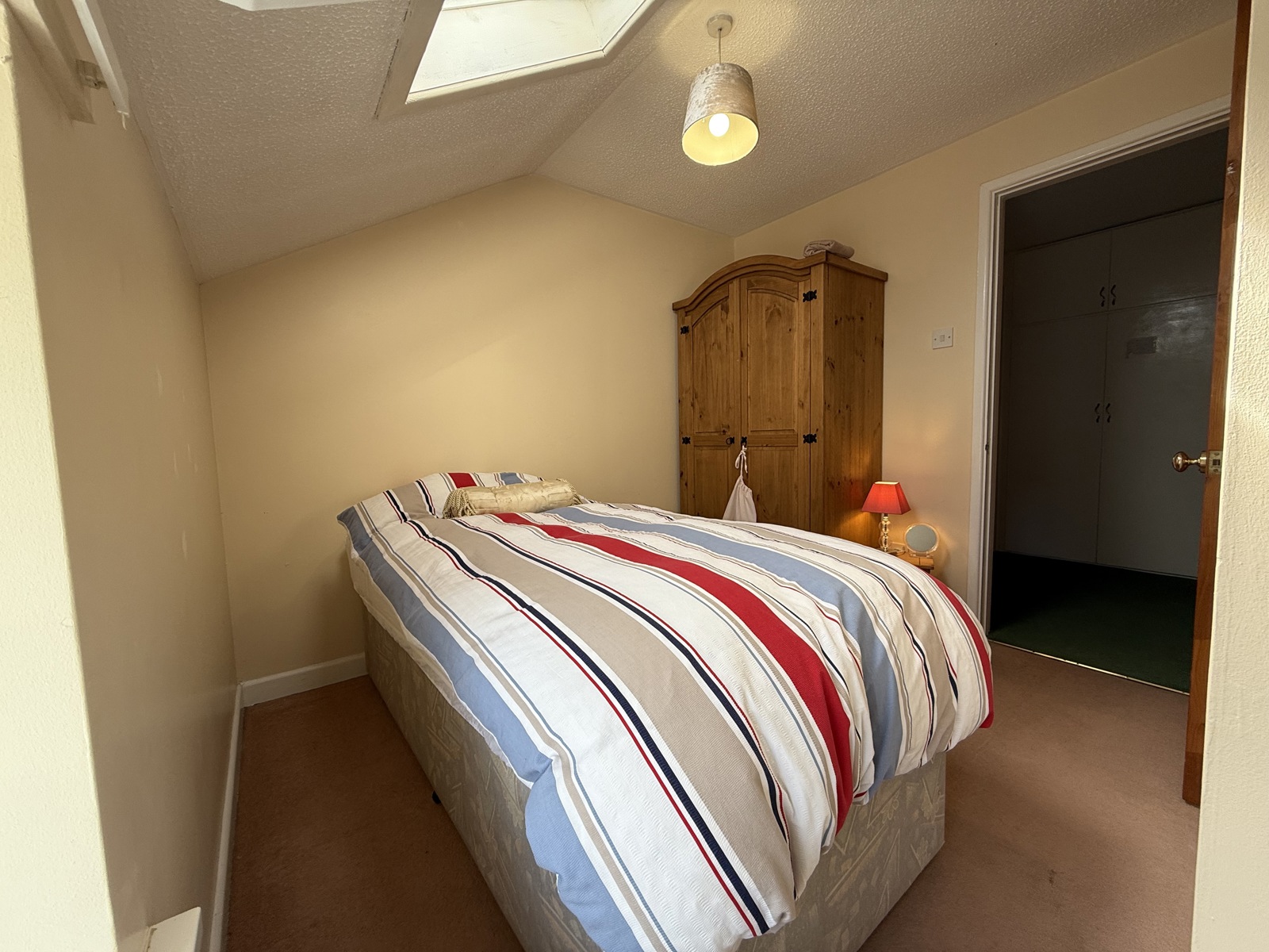 The master bedroom enjoys both a window and Velux roof light, with a carpeted floor for added comfort. Storage cupboard for added convenience.