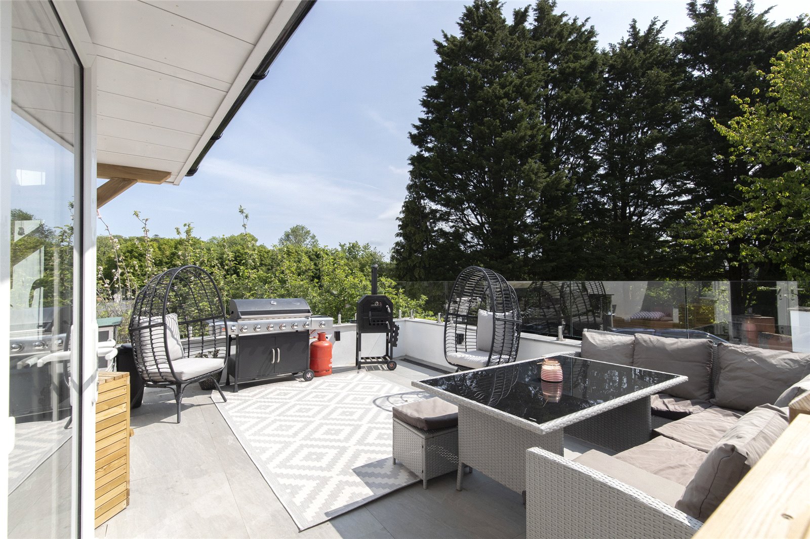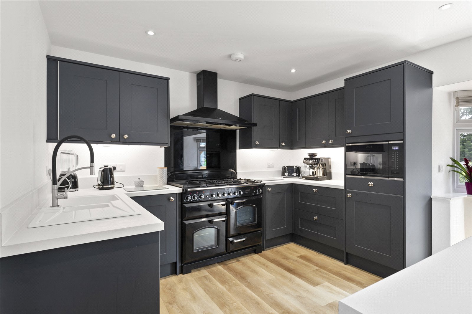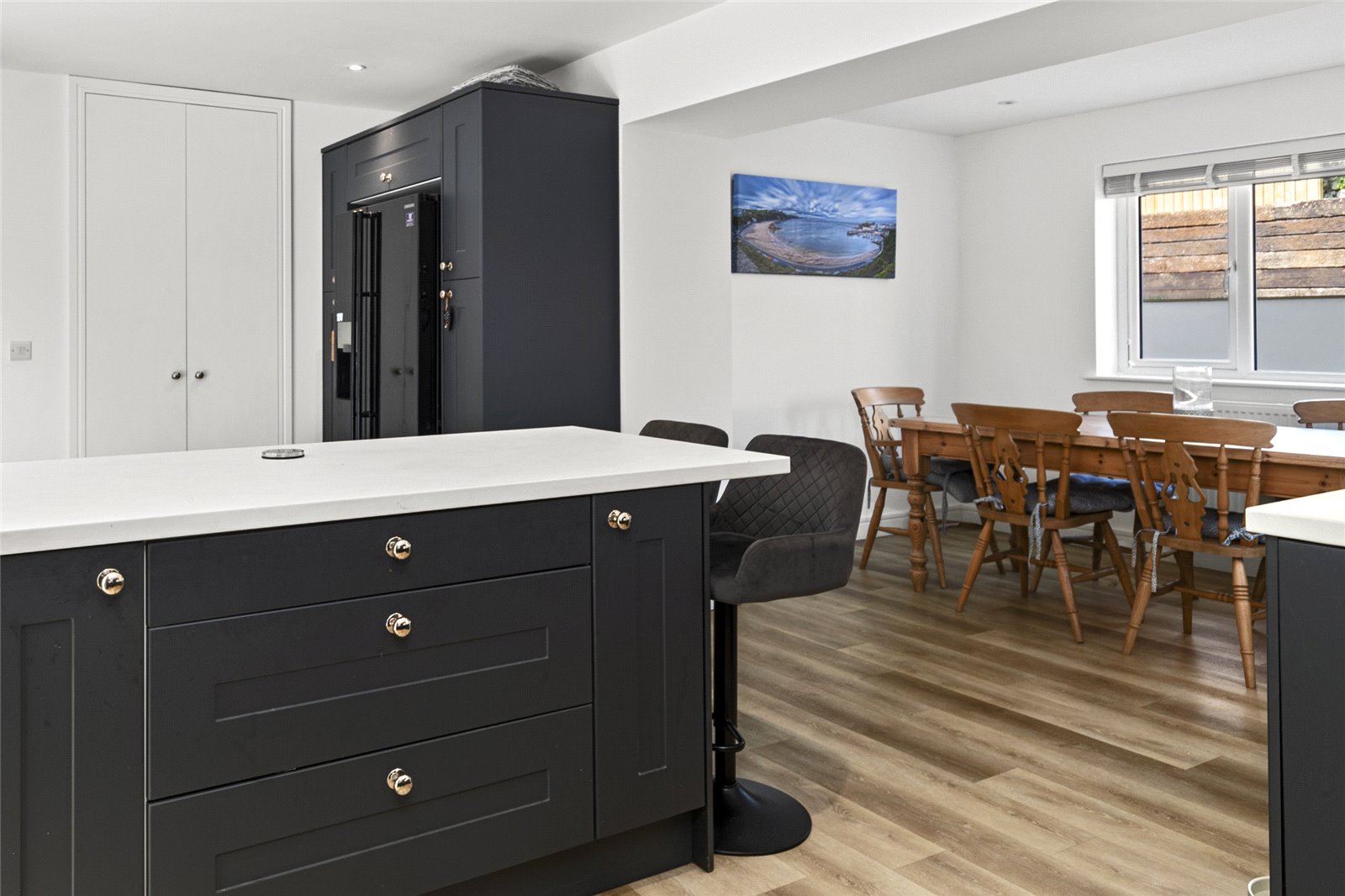 LVT flooring, range of base and eye level units with marble effect worktops and matching island, 1.5 sink and draining board, space for cooker with extractor over, built in microwave and dishwasher, space for American fridge freezer with unit surround, built in larder cupboard, two radiators, double glazed uPVc window to rear and door to side, double glazed uPVC patio doors accessing front al fresco dining area.