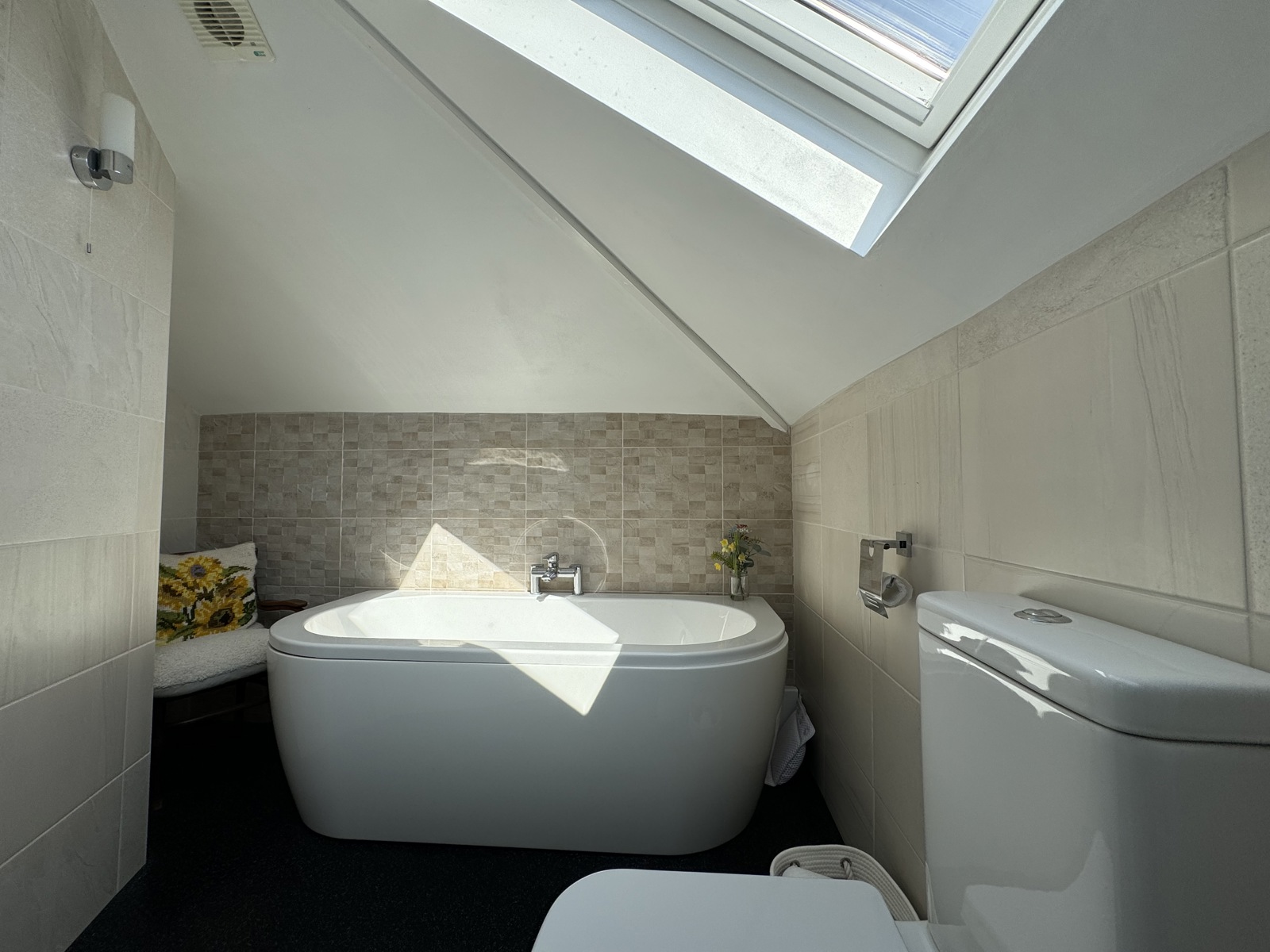 Vinyl Flooring, Velux Window To Rear, Tiled Walls, WC, Wash Basin, 1 x Radiator, Bath.