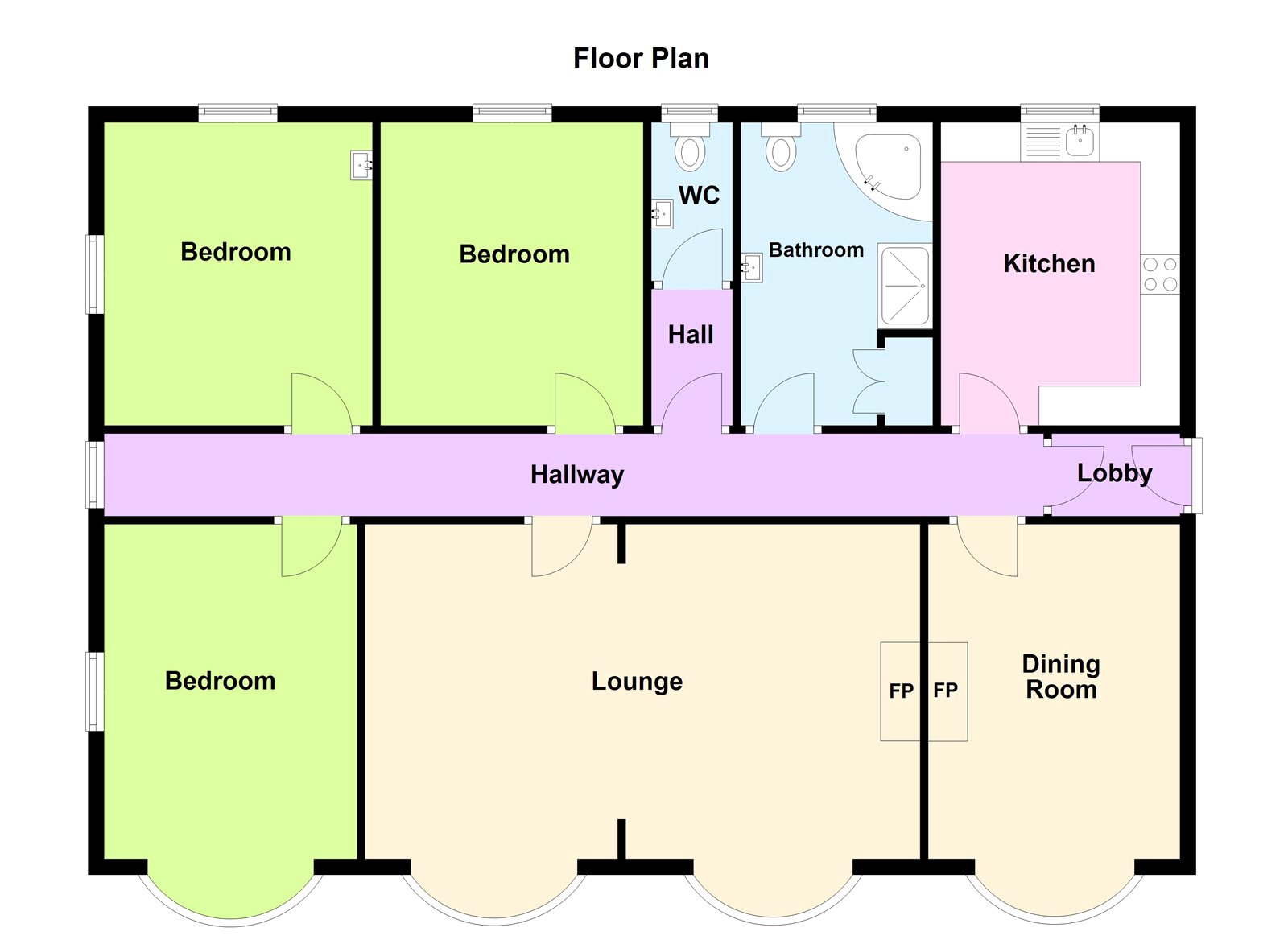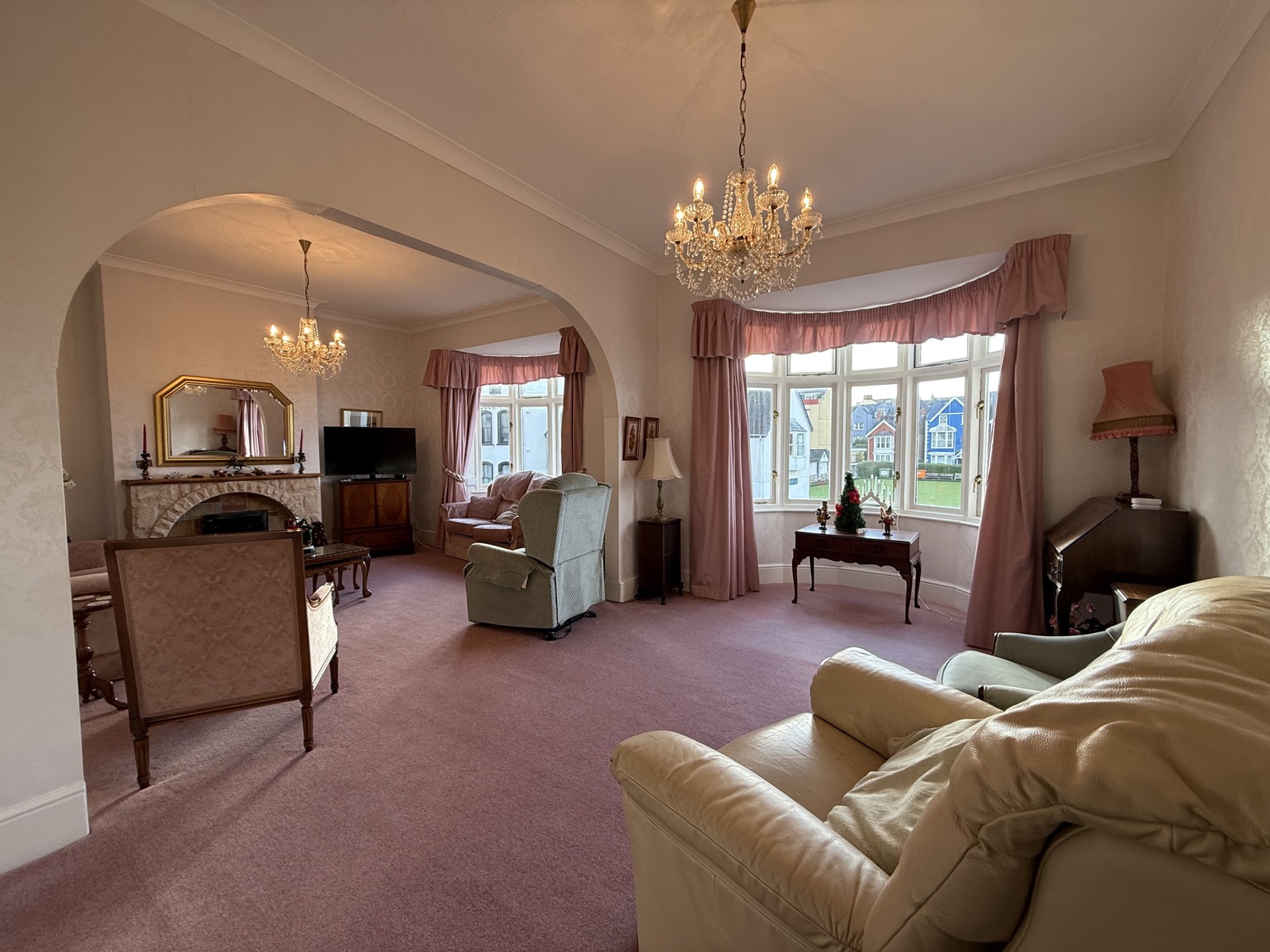 Two large single glazed bay windows overlooking Tenby’s bowling green adding the feeling of space and light into the spacious living room, electric decorative fireplace, stone feature fireplace, rose carpet throughout.