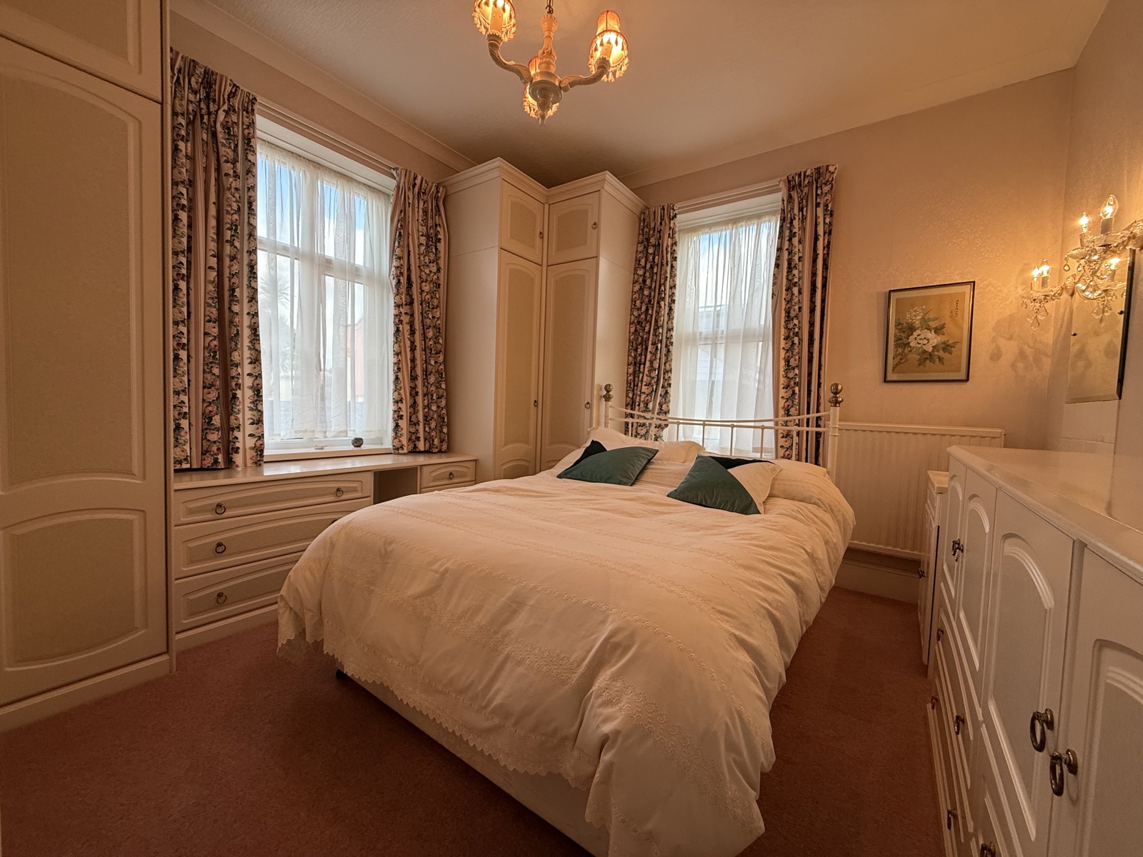 Two double glazed UPVC windows, built in wardrobes throughout the room as well as a built-in vanity desk, ivory sink and vanity unit, radiator, light pink carpet throughout.